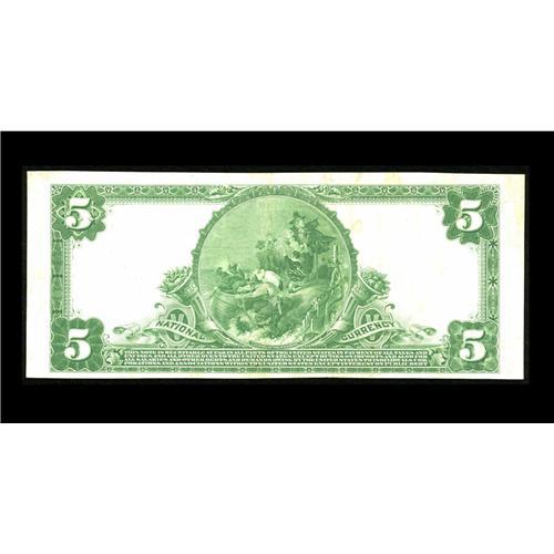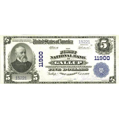 <B>Gallup, NM</B></I> - $5 1902 Plain Back Fr. 607 <B>The First NB</B></I> Ch. # 11900<BR>Another in this run of outstanding New Mexico notes we are privileged to offer in this sale. This piece traces its pedigree back to the J.L. Irish collection sale in August of 1997, where it was lot 625. This attractive example is one of the few high grade large notes known from here, and remain the nicest such note offered at public sale during the past decade. Pleasing <B>Very Fine+,</B></I> with purple signatures.