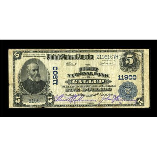 <B>Gallup, NM</B></I> - $5 1902 Plain Back Fr. 607 <B>The First NB</B></I> Ch. # 11900<BR> A pleasing large example from the only collectible bank in town. <B>Fine,</B></I> with bright purple signatures.<BR><BR><b>Shipping:</b> Coins & Currency (<a target="_blank" href="http://www.heritageauctions.com/common/shipping.php">view shipping information</a>)