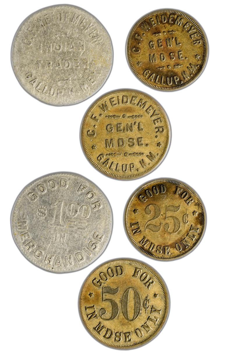 Lot of three tokens: obverse: C.F. Weidemeyer / Gen'l / Mdse. / Gallup, N.M.; reverse: Good For/ 25,50,$1.00 / In Mdse. Only. Br($1 white metal), 27,29,33mm, R6-9. Very fine through about uncirculated. Very good through fine condition. A railroad, commerical and mining center on U.S. 66.
