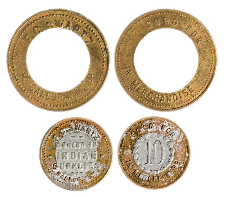 Two tokens, including one unlisted Bimetallic piece. Obverse: F.C. Swartz / dealer In / Indian / Supplies ; reverse: Good For / 10c / In Merchandise. Bi, 25,33mm, unlisted. This piece would probably grade fine. The, $1 piece is missing the aluminum center, and is extremely fine. This piece is listed at R10. A railroad, commercial and mining center on U.S. 66. This is one of the very few bi-metallic pieces from New Mexico.