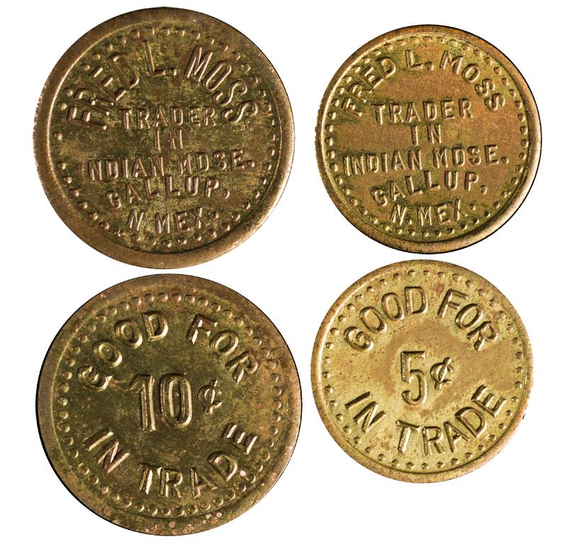 Two tokens: obverse: Fred L. Moss / Trader / In / Indian Mdse. / Gallup, / N. Mex.; reverse: Good For / 5,10c / In Trade. Br, 21,24mm, R8,10. Very good condition. A railroad, commerical and mining center on U.S. 66.
