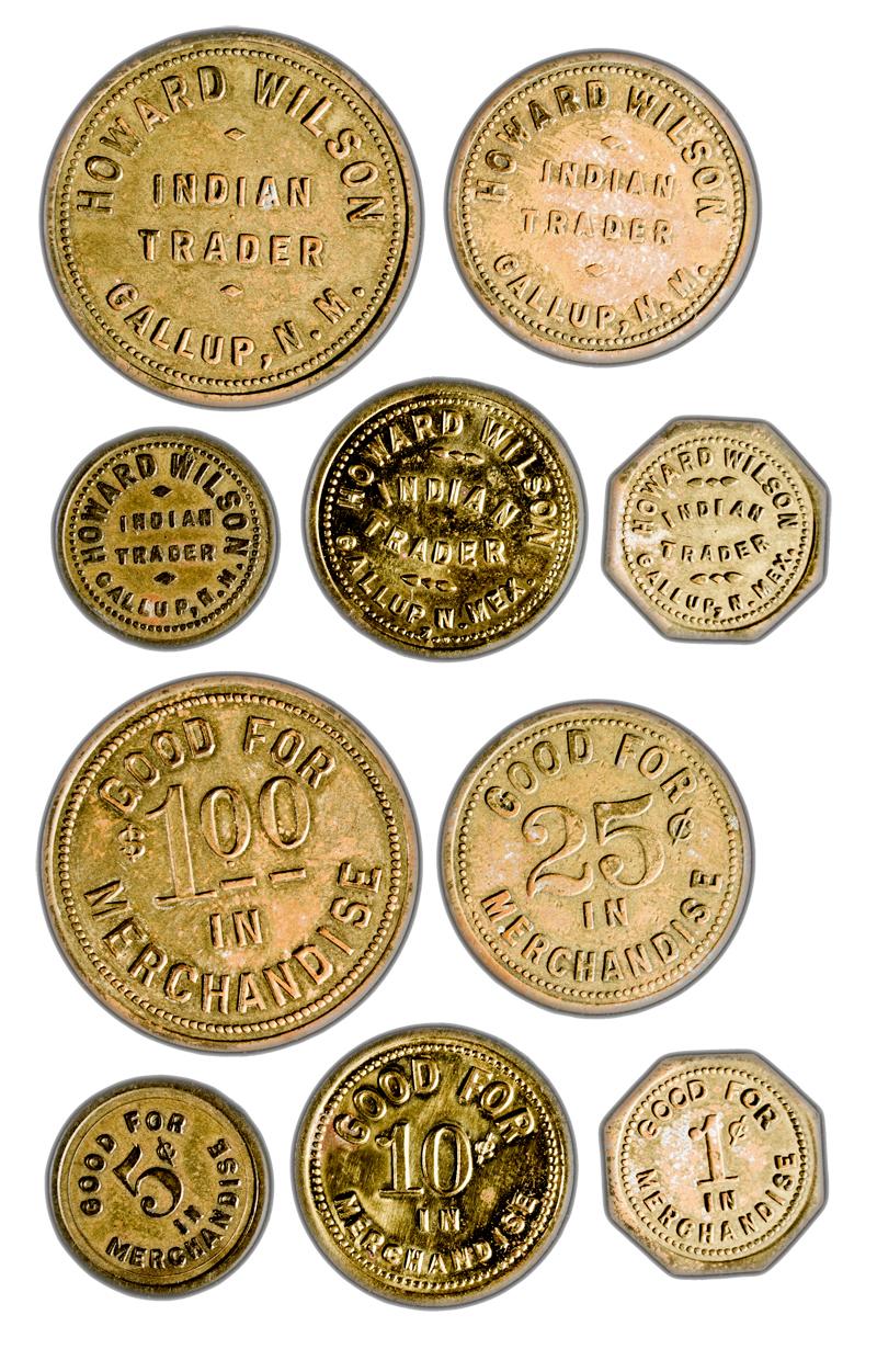 Lot of five tokens: obverse: Howard Wilson / Indian / Trader / Gallup, N.M.; reverse: Good For/ 1,5,10,25,$1.00 / In / Merchandise. Br, 18,21,22,29,31mm,R9-10. Very fine through about uncirculated. A railroad, commerical and mining center on U.S. 66.