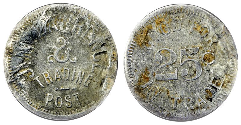 Obverse: J.M. Lawrence / Trading / Post; Reverse: Good For / 25c / In Trade. Poor condition, dug. A railroad, commerical and mining center on U.S. 66.