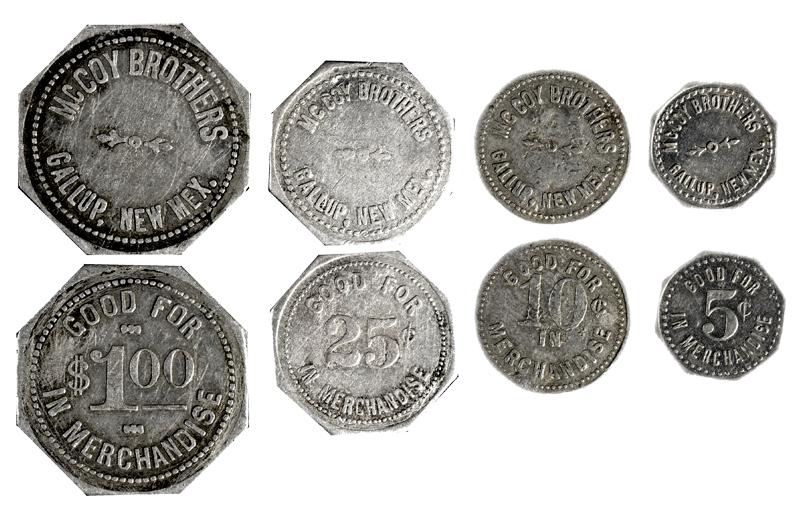Four tokens: obverse: McCoy Brothers / Gallup, New Mex.; reverse: Good For /5,10,25,$1.00 / In Merchandise. Al, 3 oc, 1 rd, 21,25,28,$1.00, R9. Very good to fine condition. A railroad, commerical and mining center on U.S. 66.