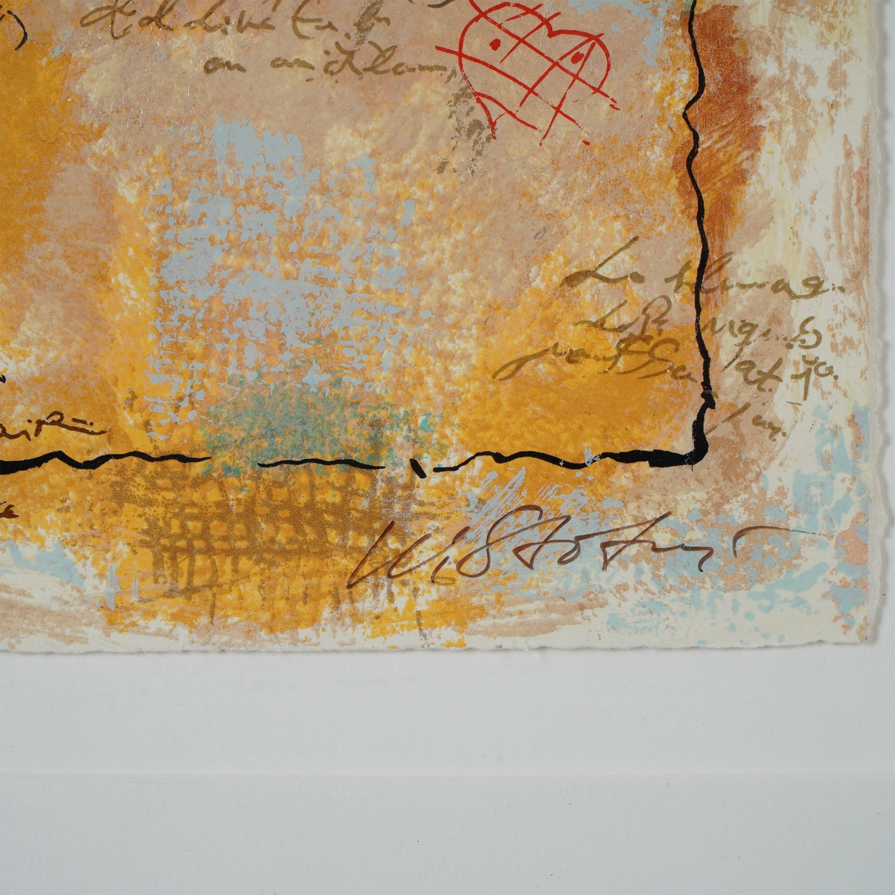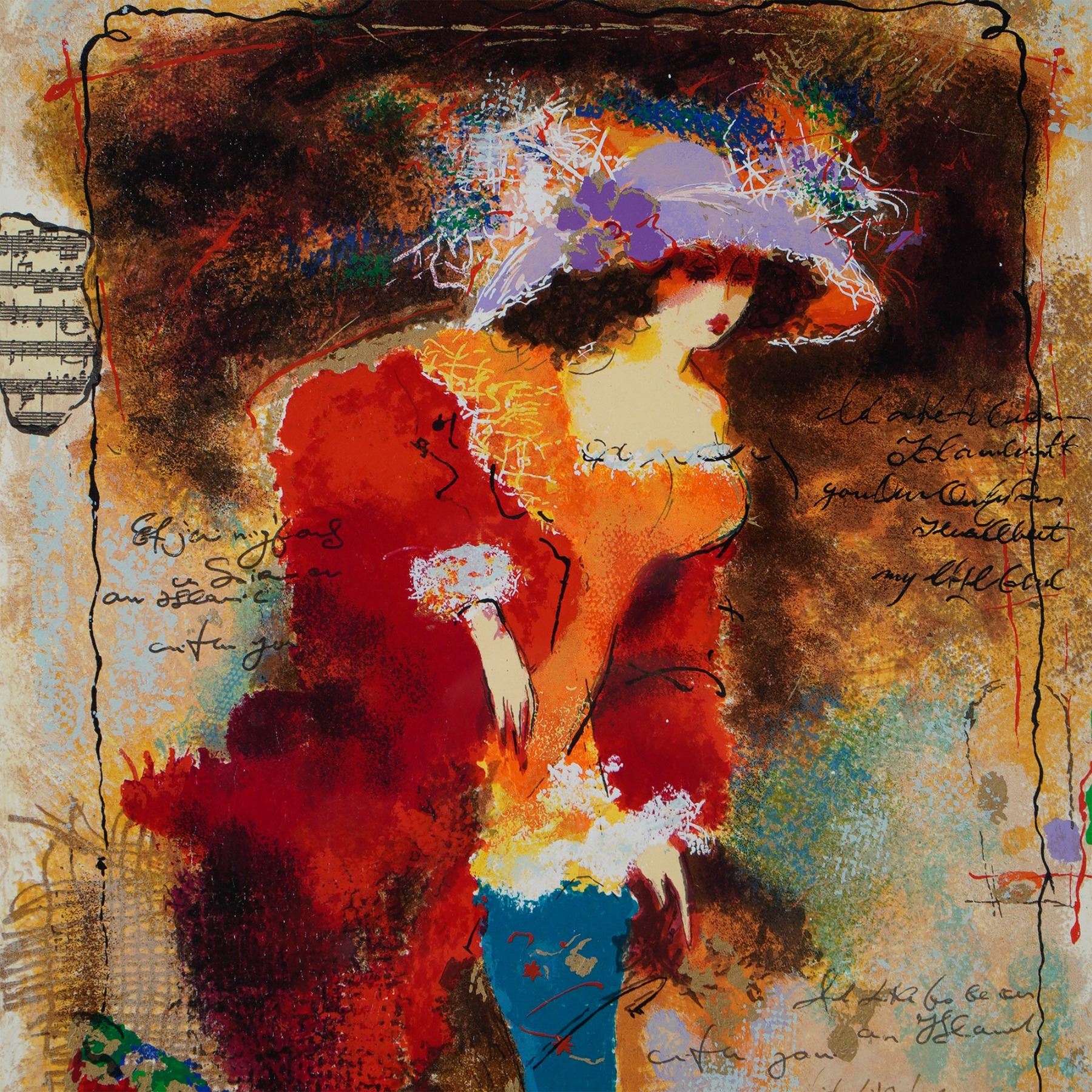 This limited edition mixed media Serigraph in color on wove paper by renowned artistic duo Alexander Galtchansky (1959-2008) and Tanya Wissotzky (1959-2006) showcases their signature romantic and whimsical style, blending calligraphy, collage, and impressionist painting techniques. The artwork features an elegantly dressed woman in a vibrant red coat and blue stockings, surrounded by intricate handwritten text and decorative elements, evoking a vintage Parisian aesthetic. Numbered 37/385 and hand-signed by the artists, this piece is professionally framed in an ornate gold-tone frame with double matting, enhancing its classic yet contemporary appeal. A stunning addition for collectors of Galtchansky & Wissotzky's unique mixed media works and modern impressionist art. Artwork can be unframed and rolled for shipment.