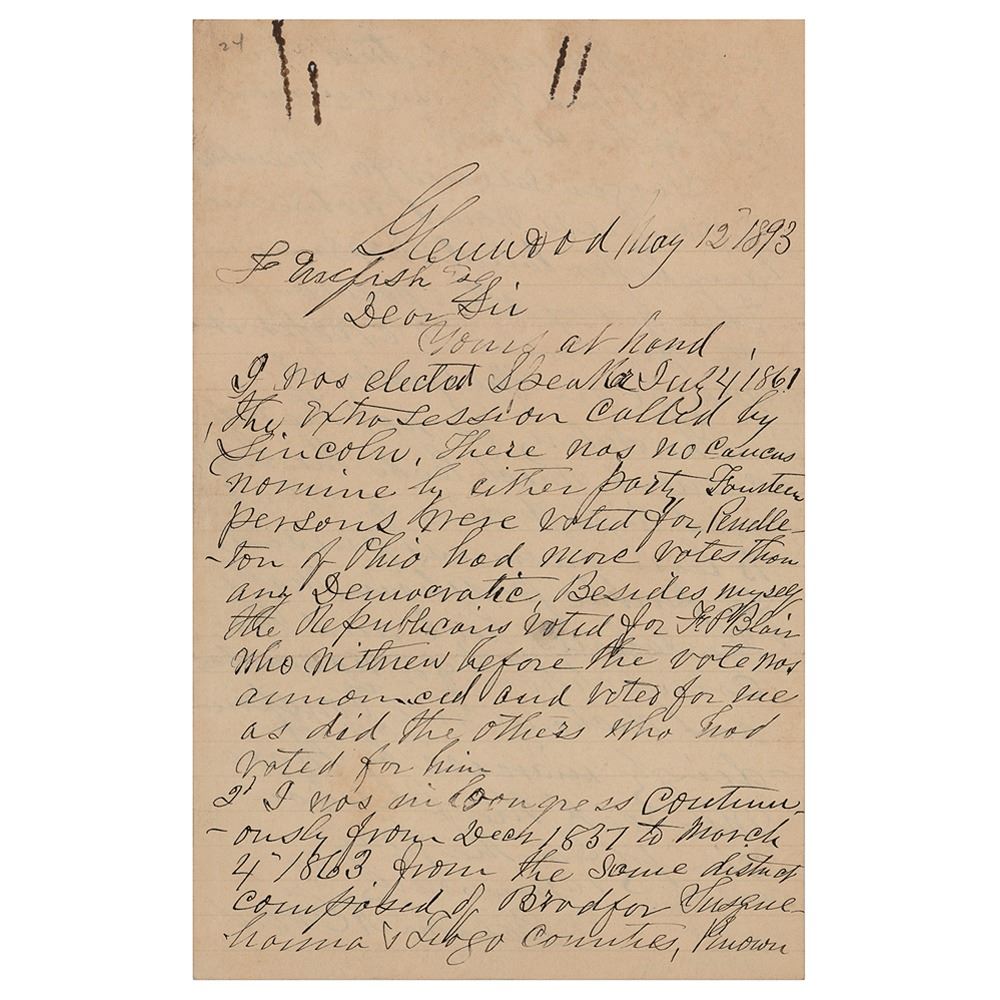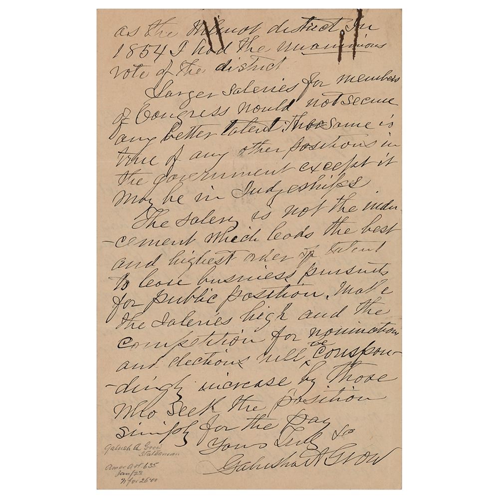 Prominent politician, lawyer, writer, and businessman (1822-1907) who served as Speaker of the House of Representatives from 1861 to 1863. ALS, one page both sides, 5.75 x 9, May 12, 1893. Handwritten letter, commenting on his election as Speaker and the compensation of members of Congress. In part: "I was elected Speaker July 4 1861 the extra session called by Lincoln. There was no caucus nominee by either party. Fourteen persons were voted for, Pendleton of Ohio had more votes than any Democratic. Besides myself the Republicans voted for F. P. Blair who withdrew before the vote was announced and voted for me as did the others who had voted for him…Larger salaries for members of Congress would not secure any better talent: the same is true of any other positions in the government except it may be in Judgeships. The salary is not the inducement which leads the best and brightest order of talent to leave business pursuits for public position. Make the salaries high and the competition for nominations and elections will be correspondingly increased by those who seek the position simply for the pay." In very good to fine condition, with rusty paperclip impressions to the top. Accompanied by an original 4.25 x 6.5 cabinet photo of Grow, signed on the mount border in ink, "Galusha A. Grow, Speaker 37th Congress"; the signature has extremely poor contrast against the dark mount, and the back of the cabinet card is skinned.