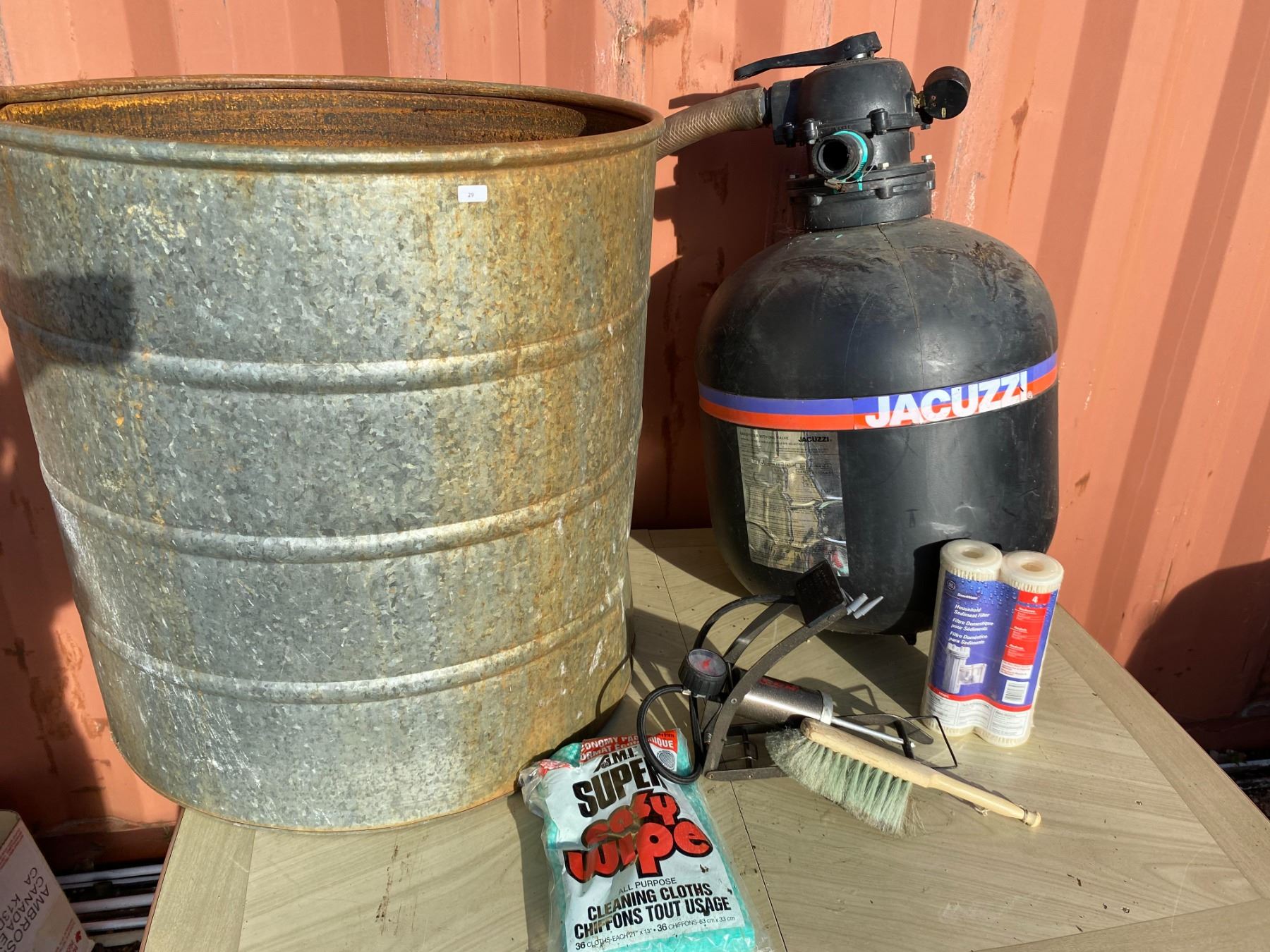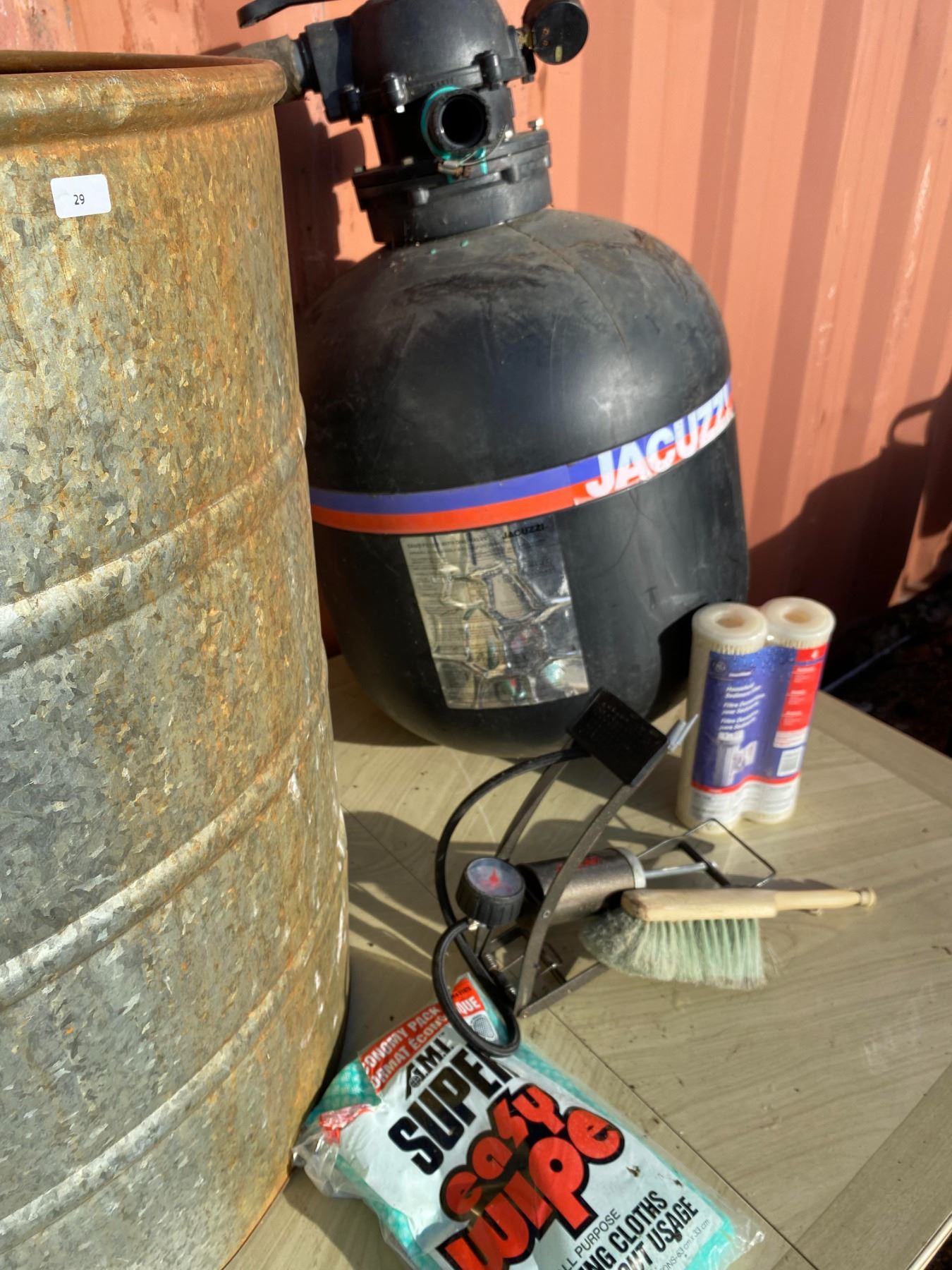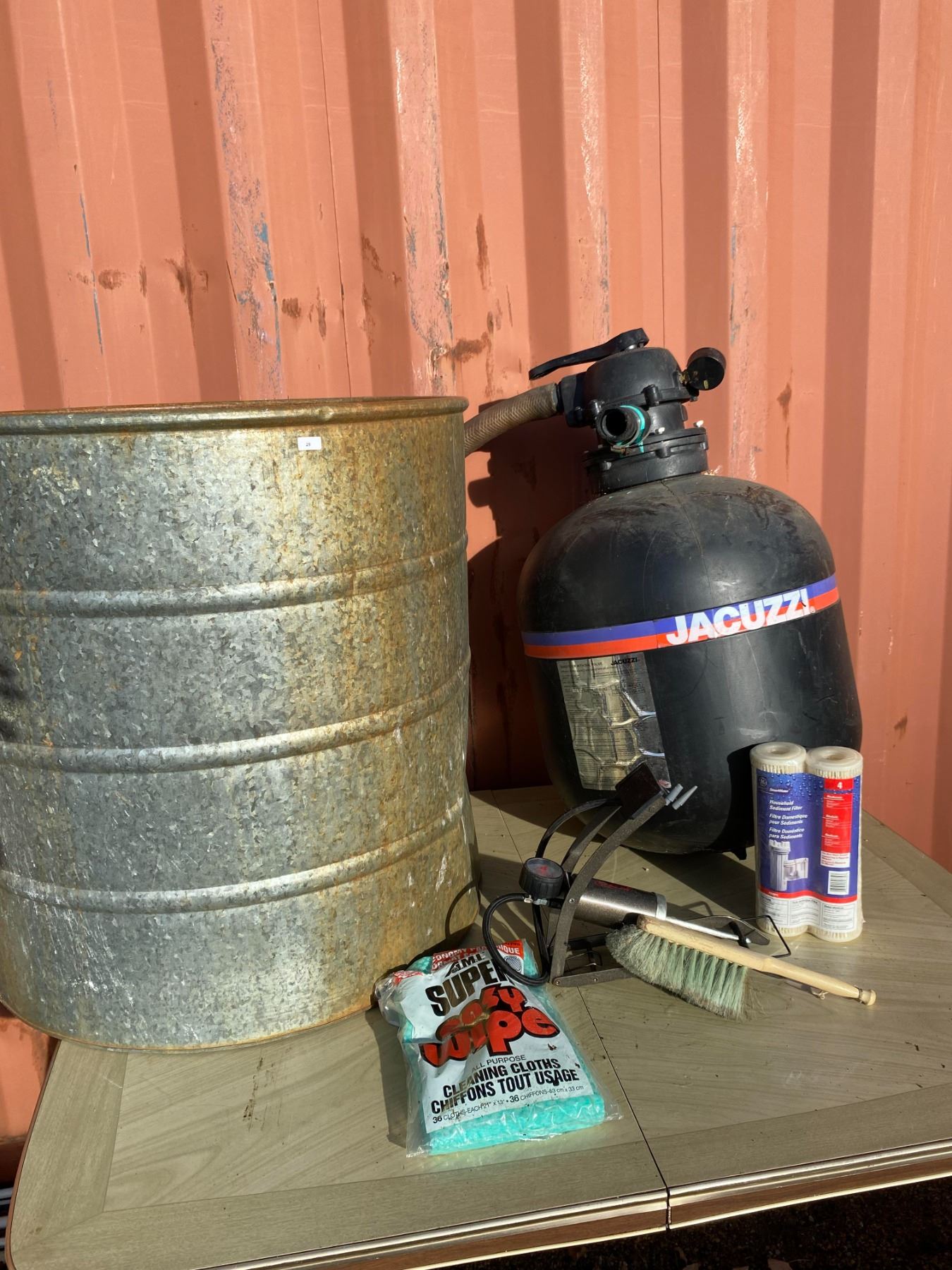 A practical mixed lot featuring a large galvanized utility barrel, a Jacuzzi filter tank (appears untested), cleaning supplies, and assorted hand tools. Ideal for workshop use, repurposing projects, or industrial decor, this grouping shows natural wear and rust that add authentic character.