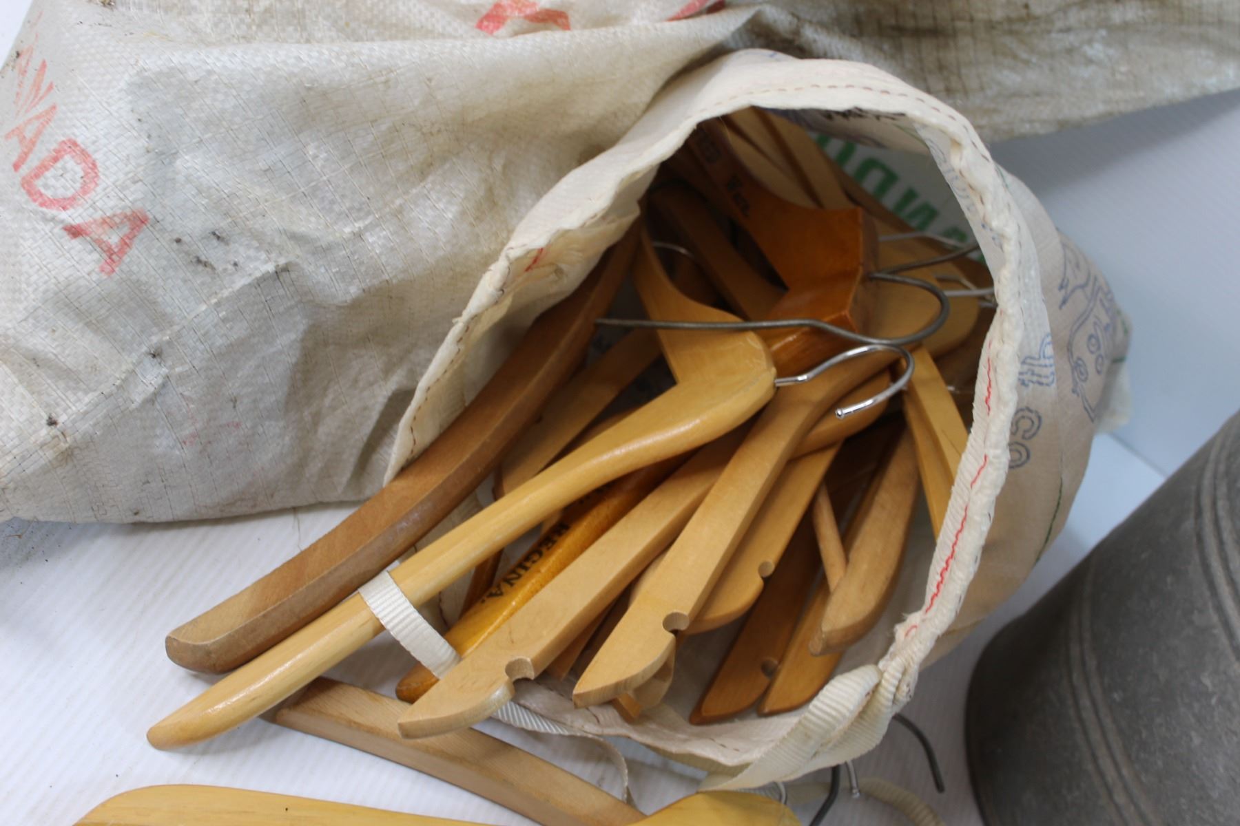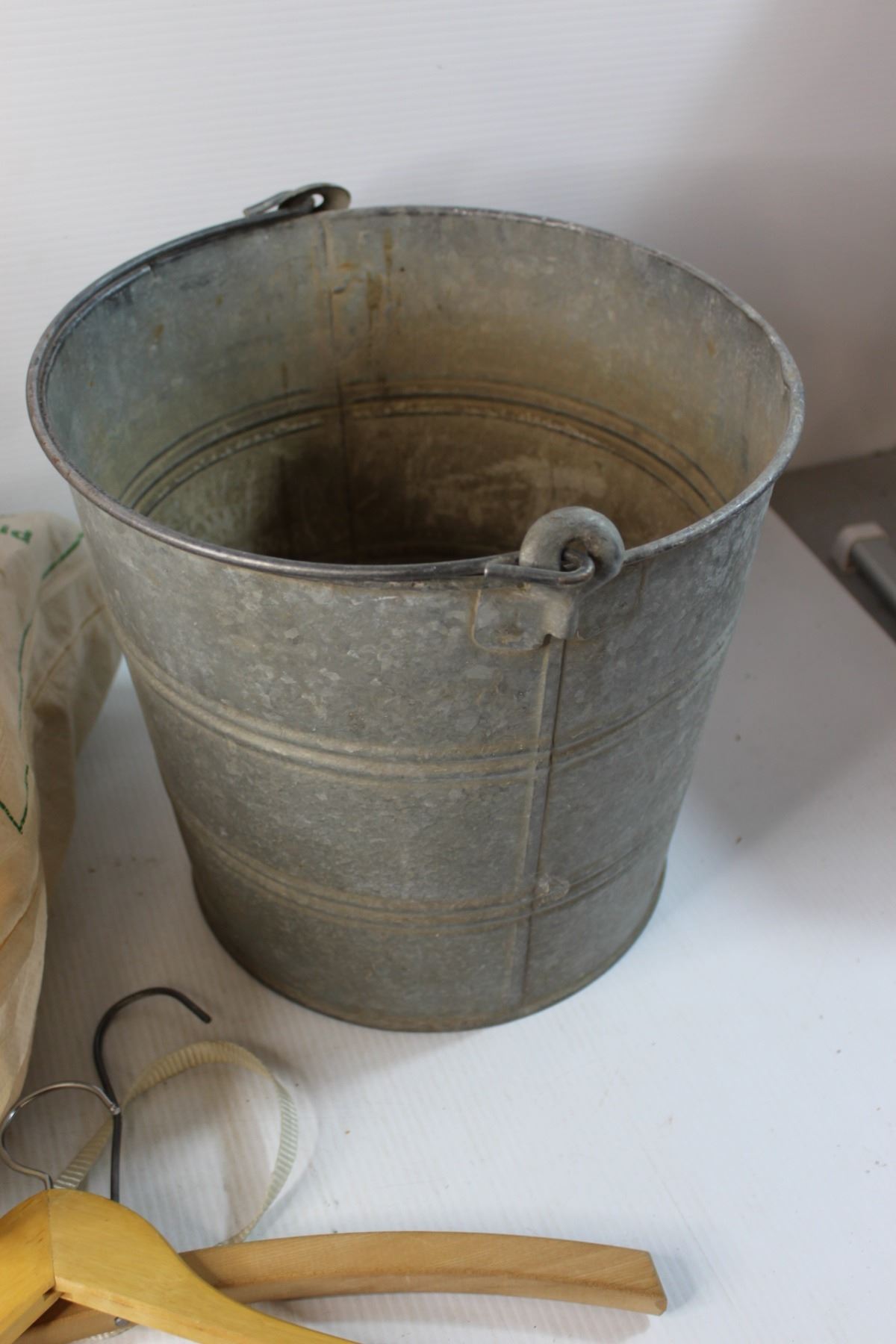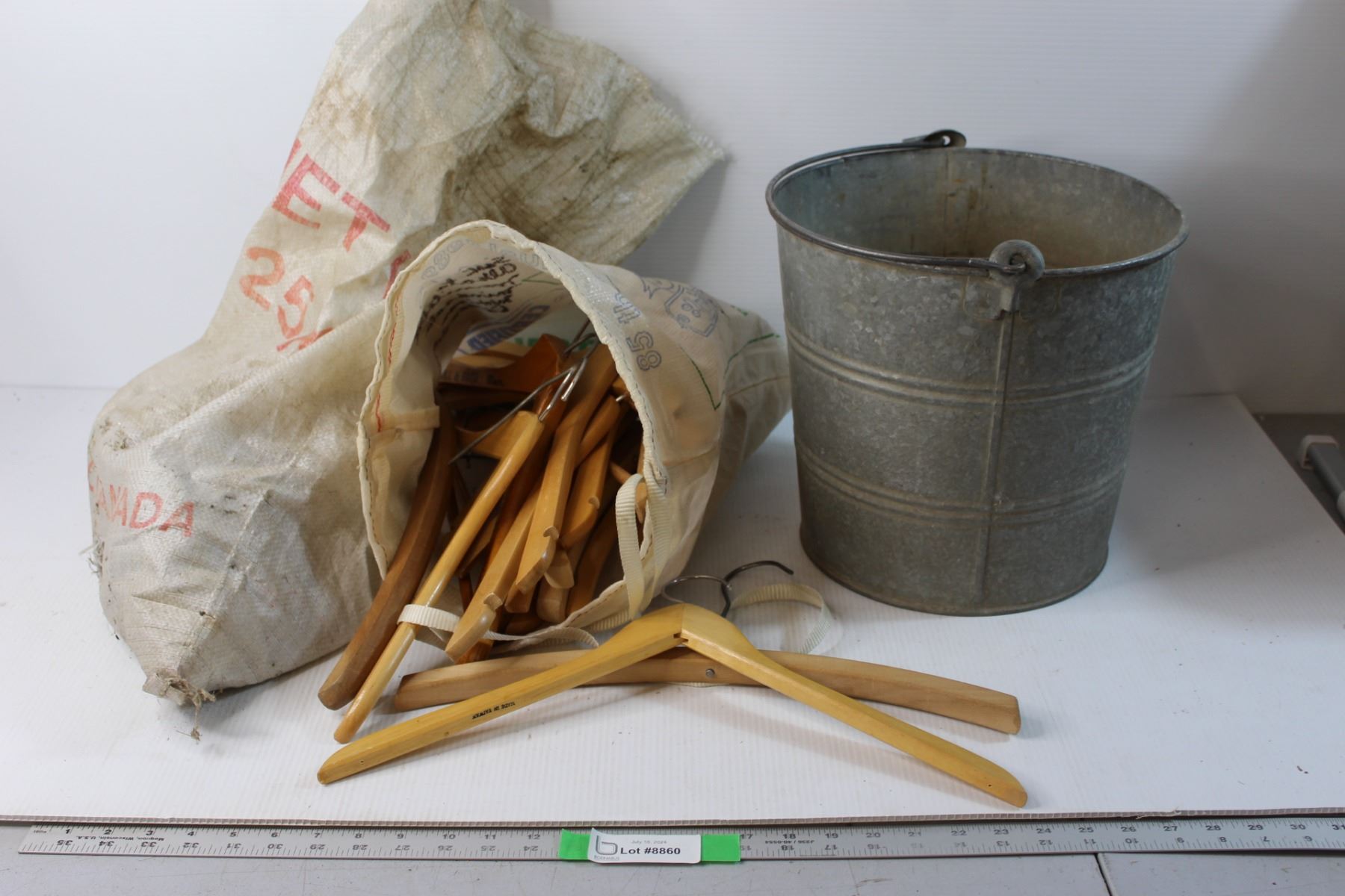 Galvanized Bucket, Coal Chunk and Assorted Wooden Hangers