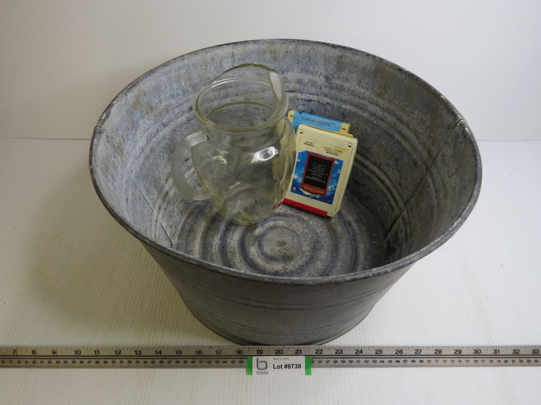 Galvanized Tub w/Handles - (2) VHS Tapes - Glass Pitcher