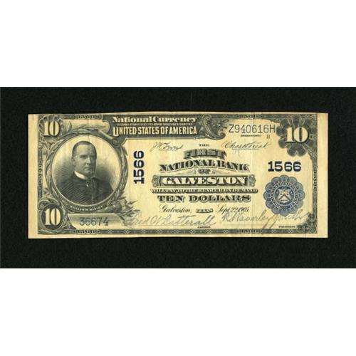 <B>Galveston, TX</B></I> - $10 1902 Plain Back Fr. 625 <B>The First NB</B></I> Ch. # 1566<BR> A pleasing <B>Very Fine-Extremely Fine</B></I> note which has an aged look due to some paper toning. Large size examples do not turn up from here very often.<BR><BR><b>Shipping:</b> Coins & Currency (<a target="_blank" href="http://www.heritageauctions.com/common/shipping.php">view shipping information</a>)