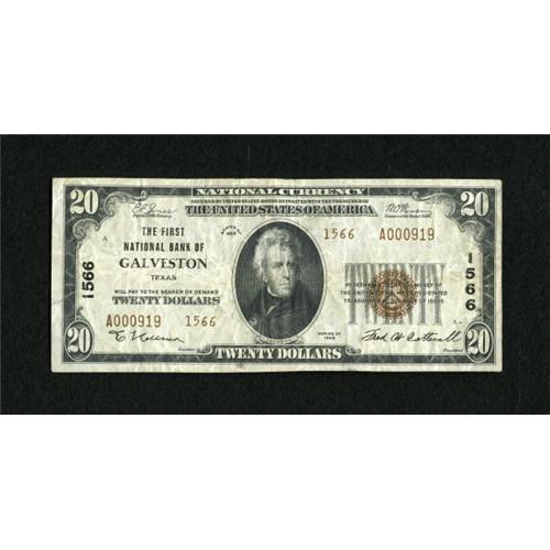 <B>Galveston, TX</B></I> - $20 1929 Ty. 2 <B>The First NB</B></I> Ch. # 1566<BR> This is the only Type 2 $20 note enumerated in the census from here. <B>Very Fine</B></I>, signed by E. Kellner and Fred W. Catterall.<BR><BR><b>Shipping:</b> Coins & Currency (<a target="_blank" href="http://www.heritageauctions.com/common/shipping.php">view shipping information</a>)