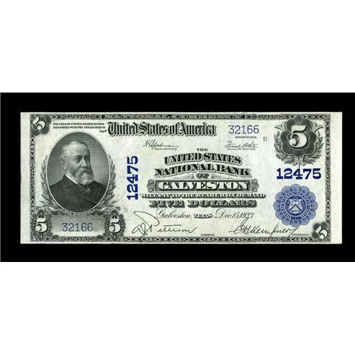 <B>Galveston, TX</B></I> - $5 1902 Plain Back Fr. 609 <B>The United States NB</B></I> Ch. # 12475<BR>A nice example from this "Forbidden Title" bank, ex-Everson collection sale. It is very close to the full uncirculated grade, but close inspection discloses a light fold or two. <B>About Uncirculated,</B></I> with engraved signatures thrown in as a bonus.<BR><BR><b>Shipping:</b> Coin/Currency (<a target="_blank" href="http://www.heritageauctions.com/common/shipping.php">view shipping information</a>)