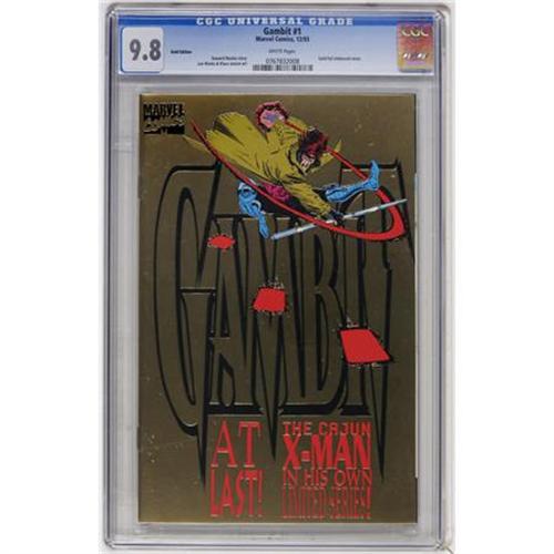 <B>Gambit #1 Gold Edition (Universal, 1993) CGC NM/MT 9.8 White pages.</B></I> Gold foil embossed cover. Overstreet 2007 NM- 9.2 value = $15. CGC census 10/07: 36 in 9.8, 1 higher.<BR><BR><b>Shipping:</b> Comics - Slabbed (certified) (<a target="_blank" href="http://www.heritageauctions.com/common/shipping.php">view shipping information</a>)