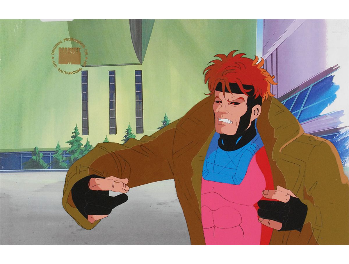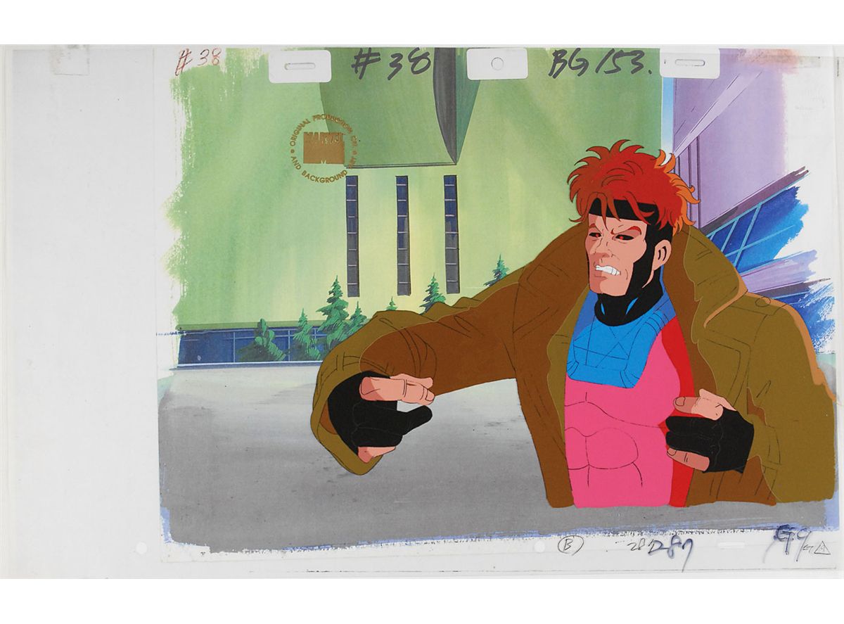 (Marvel Productions, Circa 1990s) Original production cel featuring Gambit from the X-Men television show. The cel is placed on a copy background. Image measures 11 x 7.5, with overall dimensions of 17 x 11. In fine condition.