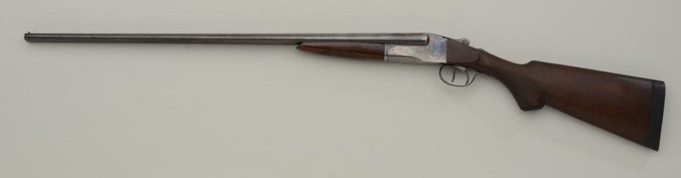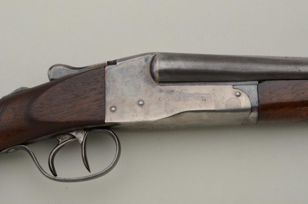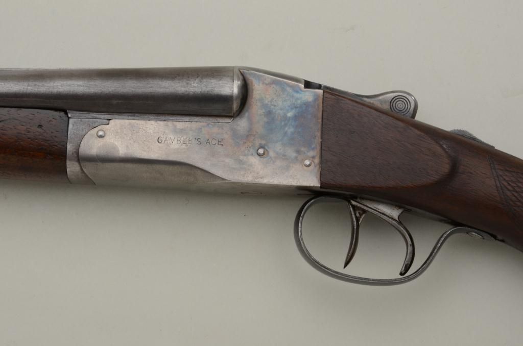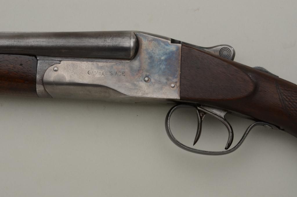 Gamble’s Ace .410 gauge American double barrel shotgun, serial number 278888 with lug on bottom of barrel marked W and BP. The inside of the action is marked patented and the gun is very similar in appearance to aLeFevre and Ithaca. The shotgun measures 42 ¼” overall with 26” barrels that are choked full and full. The barrel shows 75% to 85% original thinning blue finish and the action shows 30% to 50% original case hardenedcolors thinning at the edges with some light but evident rainbow tones. The stocks are crudely checkered by the factory and are good with some cleaning and small losses. The butt stock has been sanded lightly and oilfinished. There is a hard rubber recoil pad that has been added to extend the length of the stock and the stock now measures 14 ¼” to the end of the pad, 13 ¼” to the end of the wood. The action is tight and the bore is atleast very good and looks like it would clean to near excellent. Est.: $300-$600.