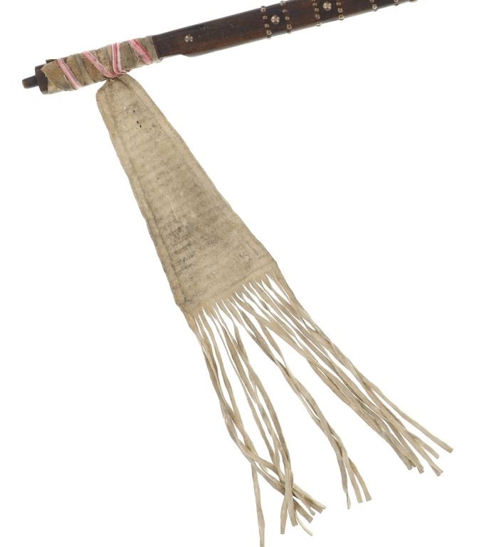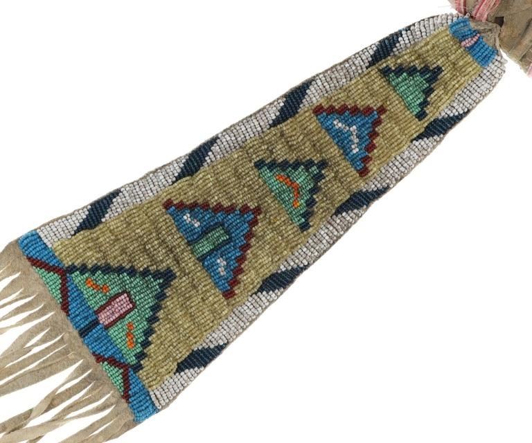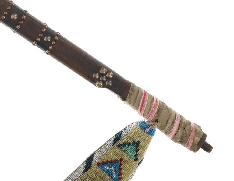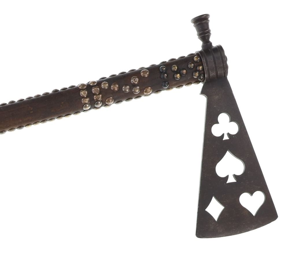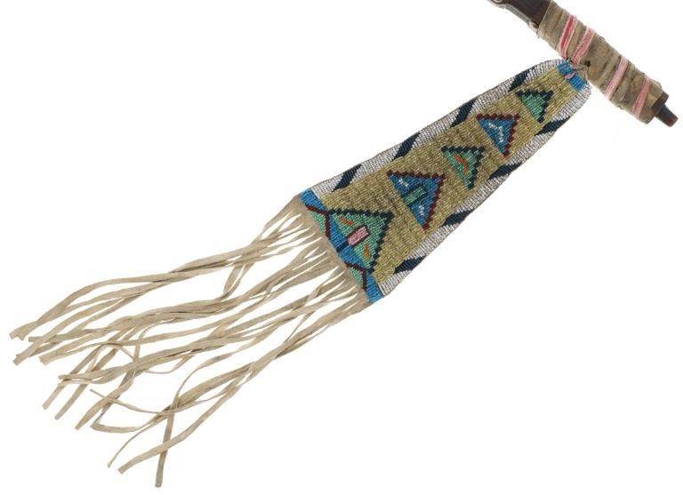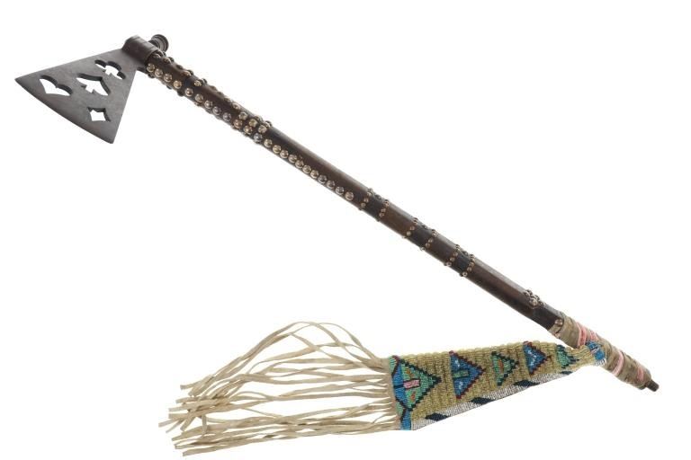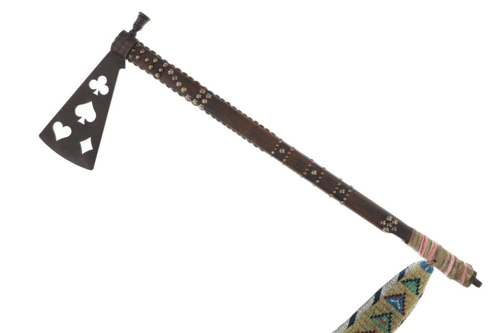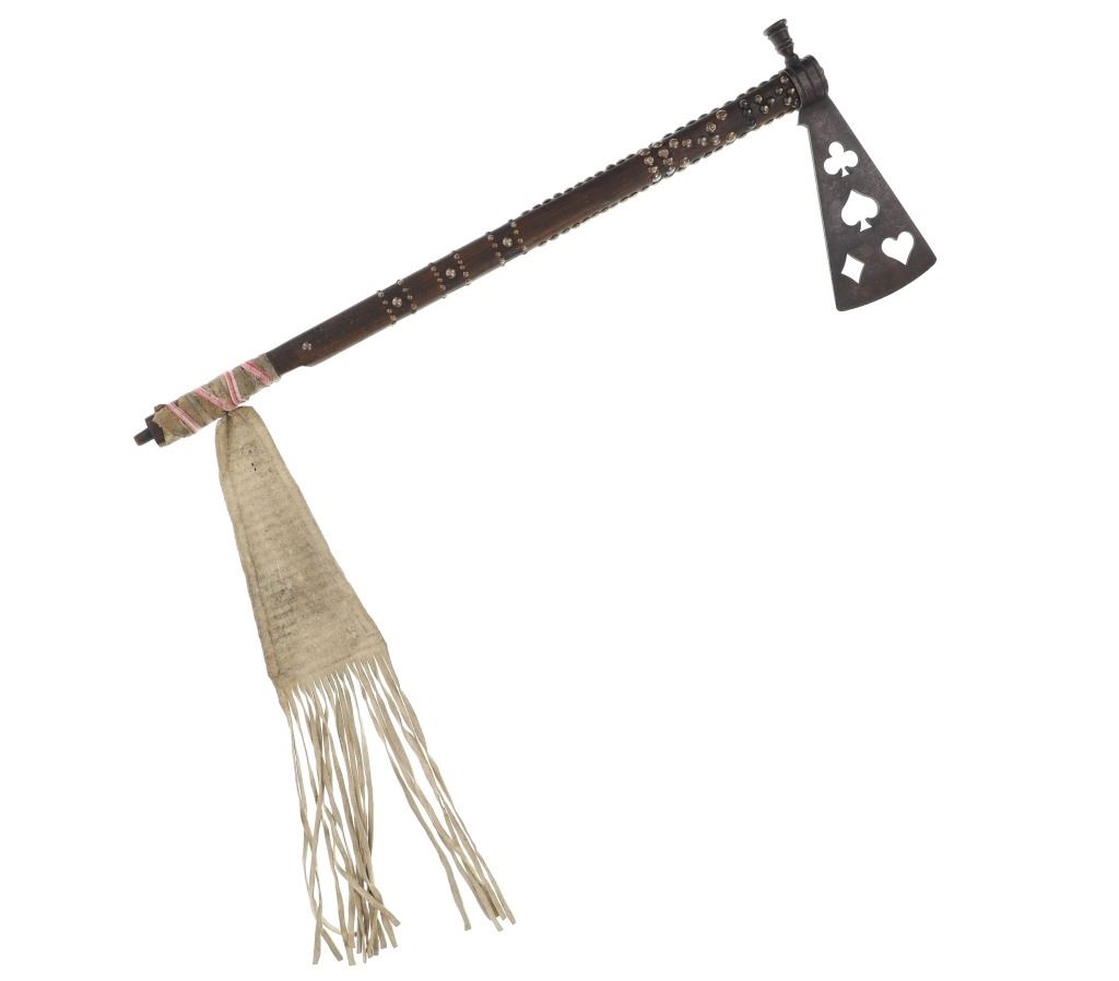 The lot features a unique and unusual “Gambler’s Tomahawk” said to be of an older to vintage age from the hand of Sioux, Jack Yellow Hawk. The tomahawk shows all four gambler card player’s suits cut out into the blade including the Club, Spade, Heart and Diamond. According to the owner history of the piece the tomahawk was collected at the Pine Ridge Indian Reservation from the tomahawks maker, Jack Yellow Hawk a Sioux member, with his wife Mary Yellow Hawk making the beaded hide drop. The piece was collected year ago from the family at Pine Ridge by Jim Aplan of Piedmont, South Dakota later selling the piece to Ben Thompson. Supposedly Ben Thompson showed the piece at the Central States Archaeological Society as part of a special exhibit. Later from the collections of Terry Haas and Ted Levy. The tomahawk shows a wide triangle western blade with curved partially sharpened blade showing four cut outs in the blade, a rear facing spur, oblong oval eye hole with heavy ridges and welded on the top a cast and turned short pipe bowls having graduated rounded ridges. The head is on a what appears to be a hardwood haft handle with darker stained color having file brandings and later brass covered metal tacks with round shanks in multiple sizes. The end is wrapped in hide, parfleche and clothe and at the bottom is tied on with hide a nice beaded Indian tanned hide drop which has supple soft condition. The beadwork is in classic Sioux geometric pattern with colors of greasy yellow, greasy blue, white, dark blue, greasy green, orange, Cheyenne pink which appear to be traditionally sinew sewn. The long fringes were cut from the same piece of hide the drop is made from. The cut outs are crisp with some machine-like ridges or grind marks. Age of the head is unknown but was noted by the collector as being from some substantial collectors. Review the piece for your own representation of age and origin. Measures overall 30”L overall with the head being 11”L and the drop is 22”L.