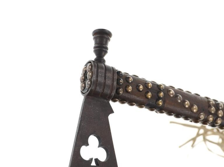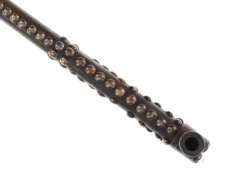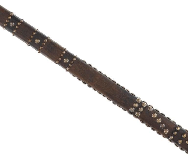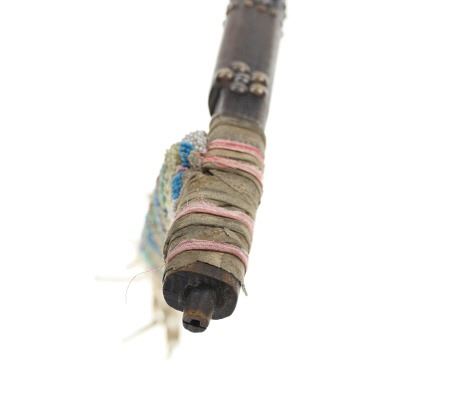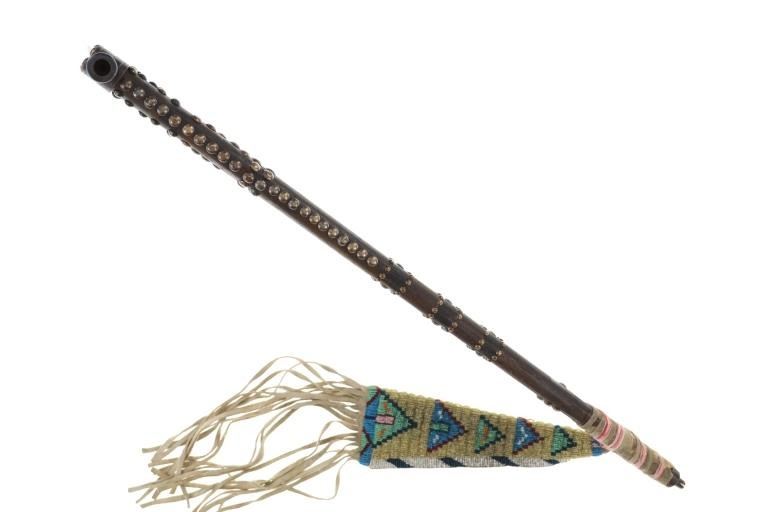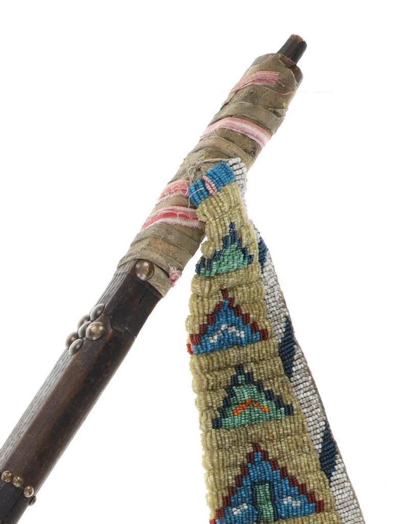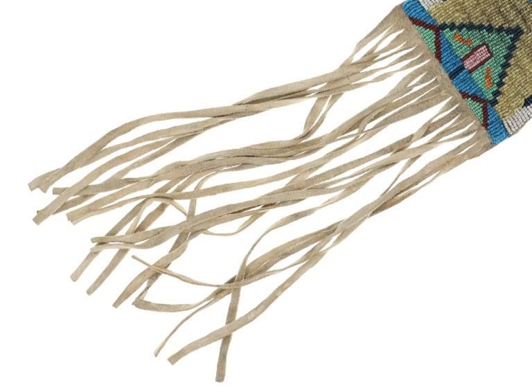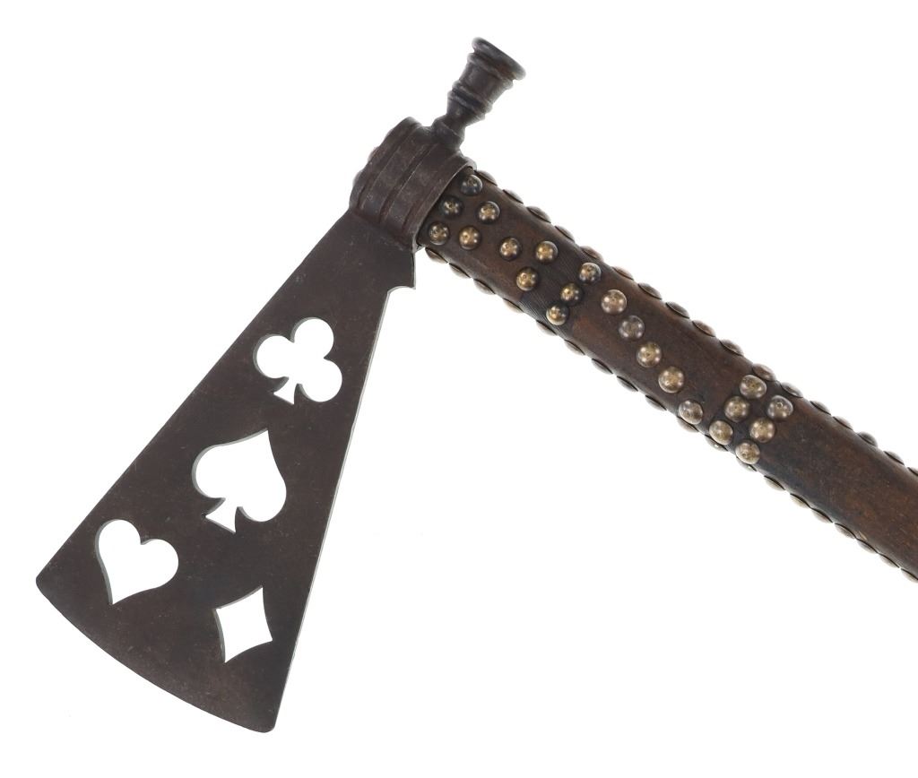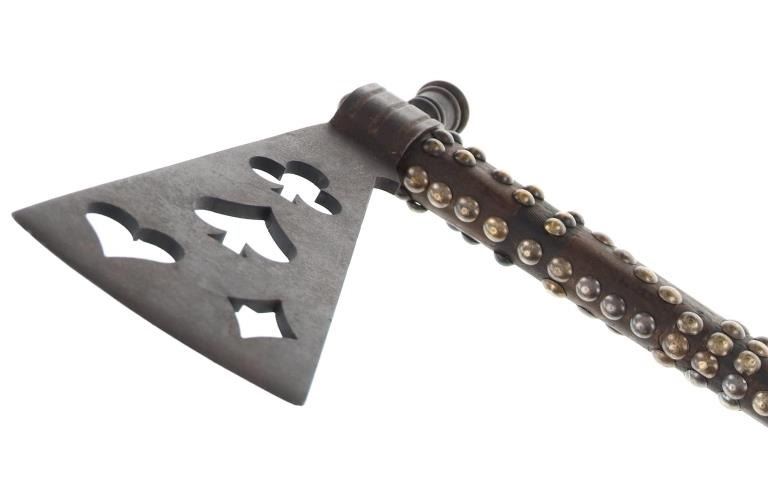 The lot features a unique and unusual “Gambler’s Tomahawk” said to be of an older to vintage age from the hand of Sioux, Jack Yellow Hawk. The tomahawk shows all four gambler card player’s suits cut out into the blade including the Club, Spade, Heart and Diamond. According to the owner history of the piece the tomahawk was collected at the Pine Ridge Indian Reservation from the tomahawks maker, Jack Yellow Hawk a Sioux member, with his wife Mary Yellow Hawk making the beaded hide drop. The piece was collected year ago from the family at Pine Ridge by Jim Aplan of Piedmont, South Dakota later selling the piece to Ben Thompson. Supposedly Ben Thompson showed the piece at the Central States Archaeological Society as part of a special exhibit. Later from the collections of Terry Haas and Ted Levy. The tomahawk shows a wide triangle western blade with curved partially sharpened blade showing four cut outs in the blade, a rear facing spur, oblong oval eye hole with heavy ridges and welded on the top a cast and turned short pipe bowls having graduated rounded ridges. The head is on a what appears to be a hardwood haft handle with darker stained color having file brandings and later brass covered metal tacks with round shanks in multiple sizes. The end is wrapped in hide, parfleche and clothe and at the bottom is tied on with hide a nice beaded Indian tanned hide drop which has supple soft condition. The beadwork is in classic Sioux geometric pattern with colors of greasy yellow, greasy blue, white, dark blue, greasy green, orange, Cheyenne pink which appear to be traditionally sinew sewn. The long fringes were cut from the same piece of hide the drop is made from. The cut outs are crisp with some machine-like ridges or grind marks. Age of the head is unknown but was noted by the collector as being from some substantial collectors. Review the piece for your own representation of age and origin. Measures overall 30”L overall with the head being 11”L and the drop is 22”L.
