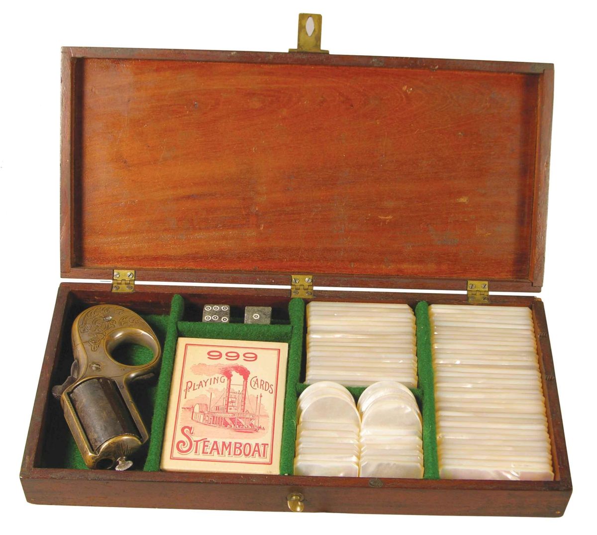 Gambler's Box in walnut including Mother of Pearl chips, 32cal. knuckle duster