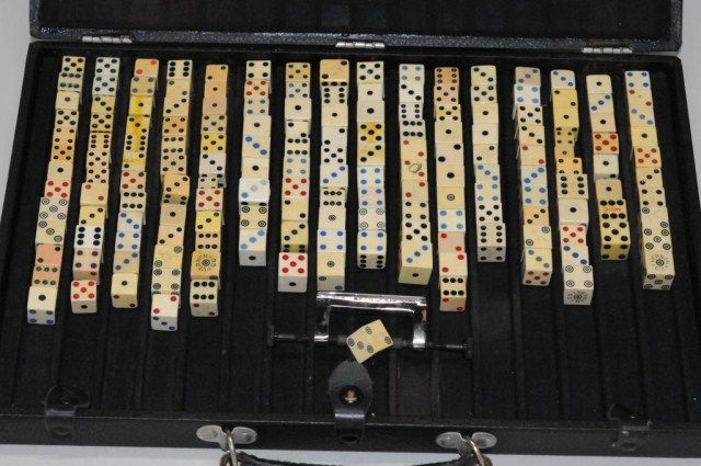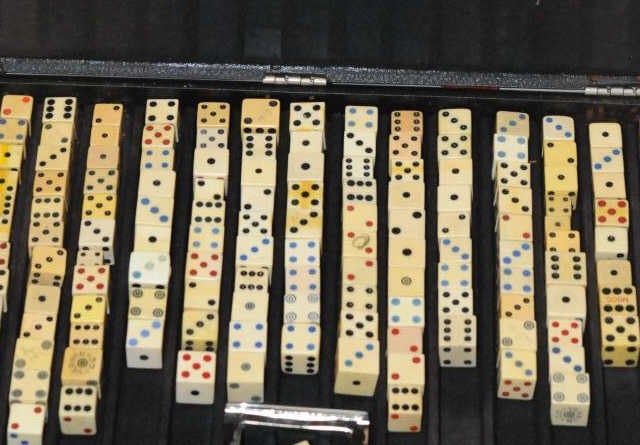 Gambler’s dice lot in leatherette covered carry case with metal vice to mark and “load” dice; over 150 older dice of various vintage and style; some appear to have already been loaded; case is in overall good condition; agreat piece of gambling ephemera. Est.: $300-$600.