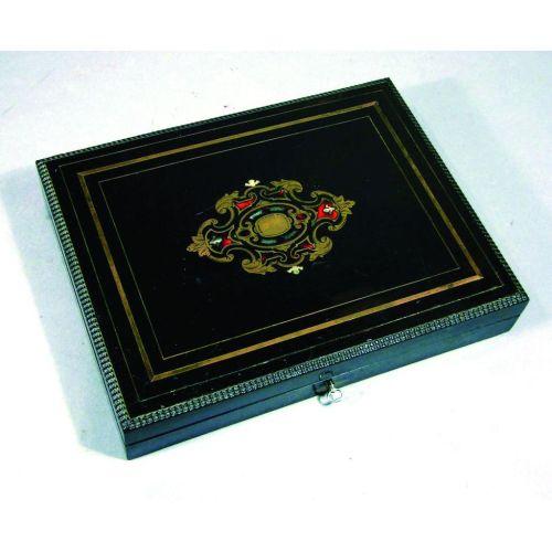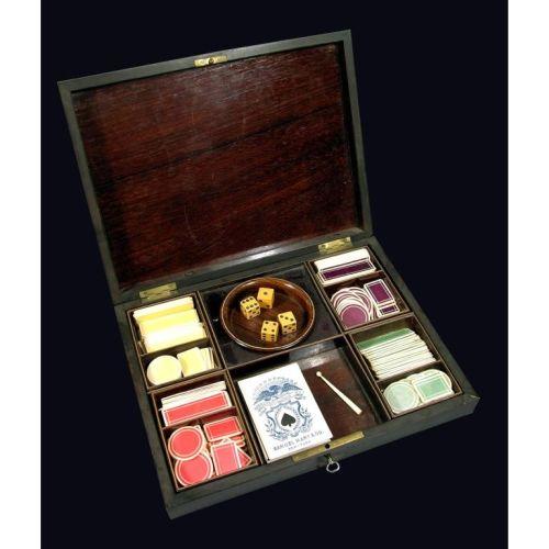 Gamblers Box, wood with inlaid metal. Includes dice, cards and chips. Good original condition. 12 X 2 X 9 inches.