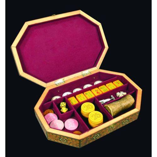 Gamblers Box with inlaid mother of pearl. Includes chips, dice, dominoes, etc. Box shows some wear otherwise good condition. 12 X 2/12 X 8 closed.