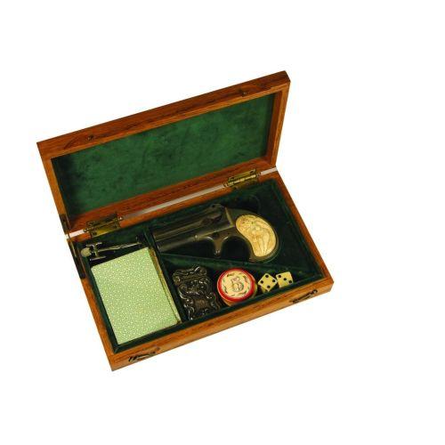 Gamblers Case, Ivory Chips and Derringer with cards, dice, matchsafe and holdouts. Derringer has an ivory handle with a prostitute engraved on it. Beautiful Oak box. Box closed is 9 1/2 x 6 x 2 inches.