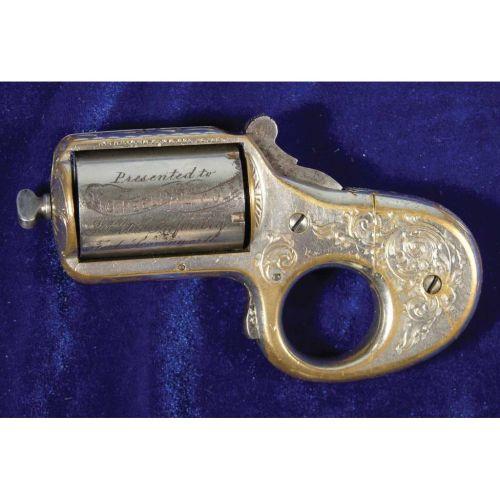 Gamblers Derringer, presented to H.C. Keeling by H. Cole of the Third US Infantry, Fort Leavenworth, Kansas. Nickel plated brass, patented 1865. Some of original nickel worn off otherwise very good condition. 5 inches long.