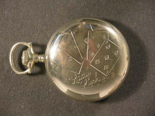 Gambler's pocket watch - playing card motif, with "Lady Luck" engraving on back - Elgin. 3" x 2" diameter. Ex. cond.