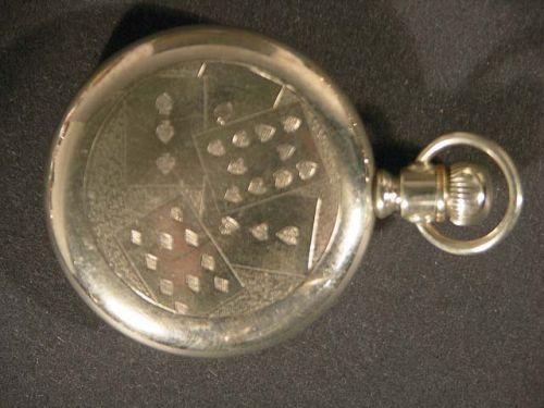 Gambler's pocket watch - playing card motif, Elgin. 3" x 2" diameter. Ex. cond.