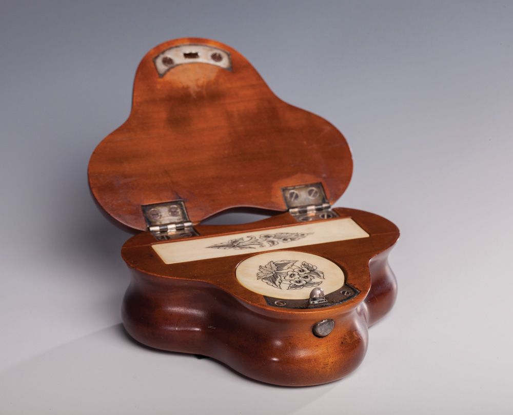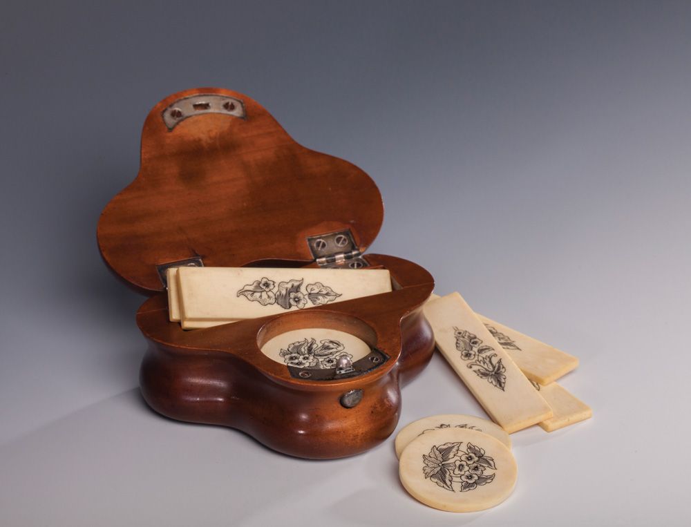 Gambling Chip Set. Beautiful scrimshaw in floral and leaf designs, on a 16 chip set consisting of 8 rectangular chips and 8 round. Set in a fine hardwood box. Circa 1880s. Ref: Dale Seymour; Indian Game called Chaupat or Vis-Gap-Tam.
