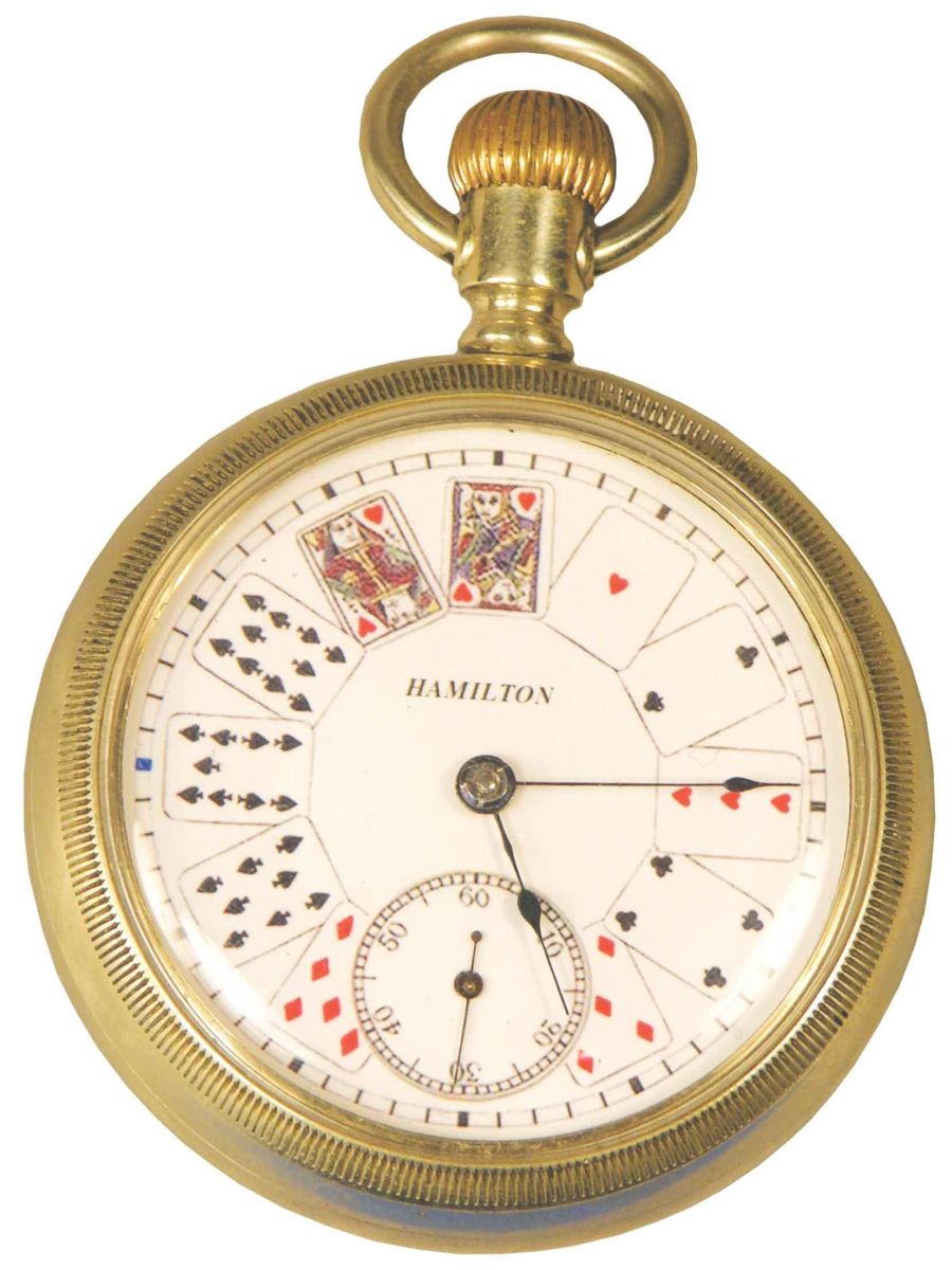 Gambling Pocket Watch, card face motif. Hamilton ca. 1900. Old watch with new face. Very good condition. 2 1/4 inch diameter.