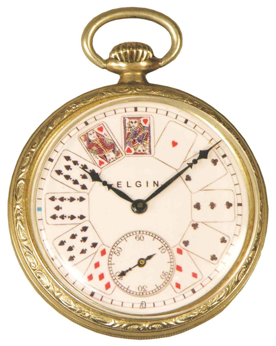 Gambling Pocket Watch, Playing Card face motif. Elgin ca. 1900. Old etched watch case monogram EM with new face. Missing crystal. 1 3/4 inch diameter.