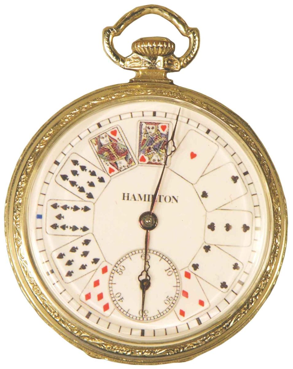 Gambling Pocket Watch, Playing Card face motif. Hamilton ca. 1900. 14kt, 17 jeweled old watch with new face, monogram P.N. 1 3/4 inch diameter.