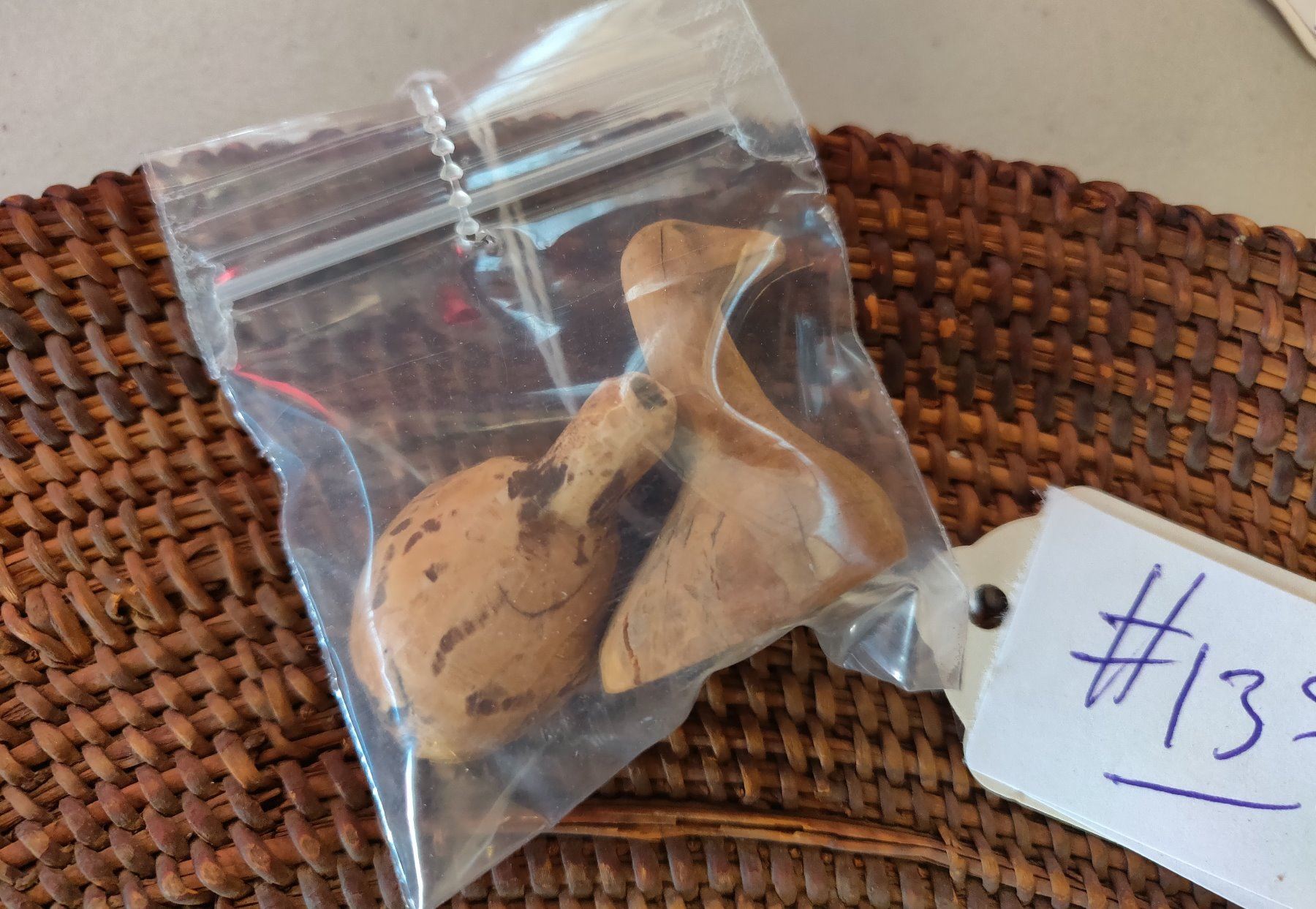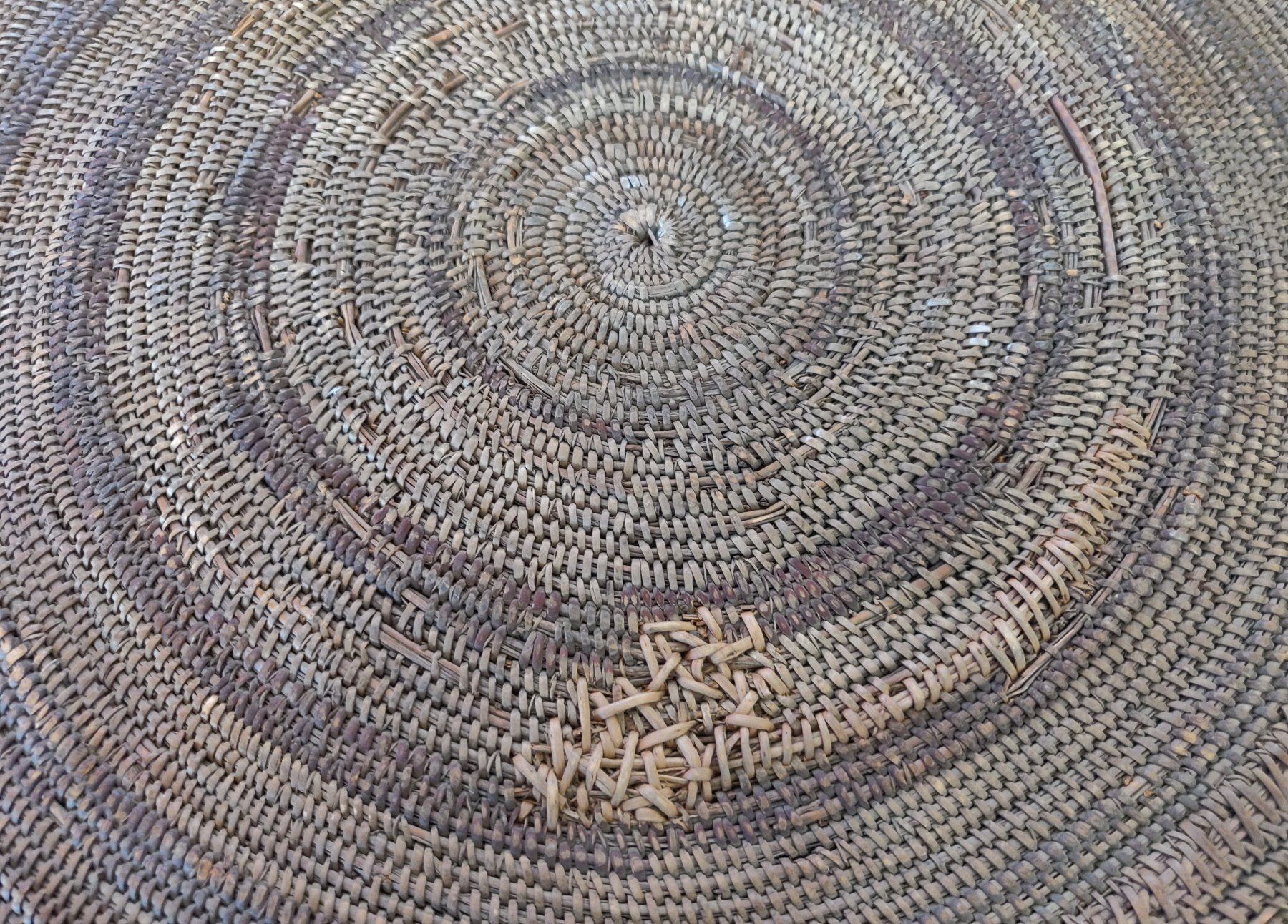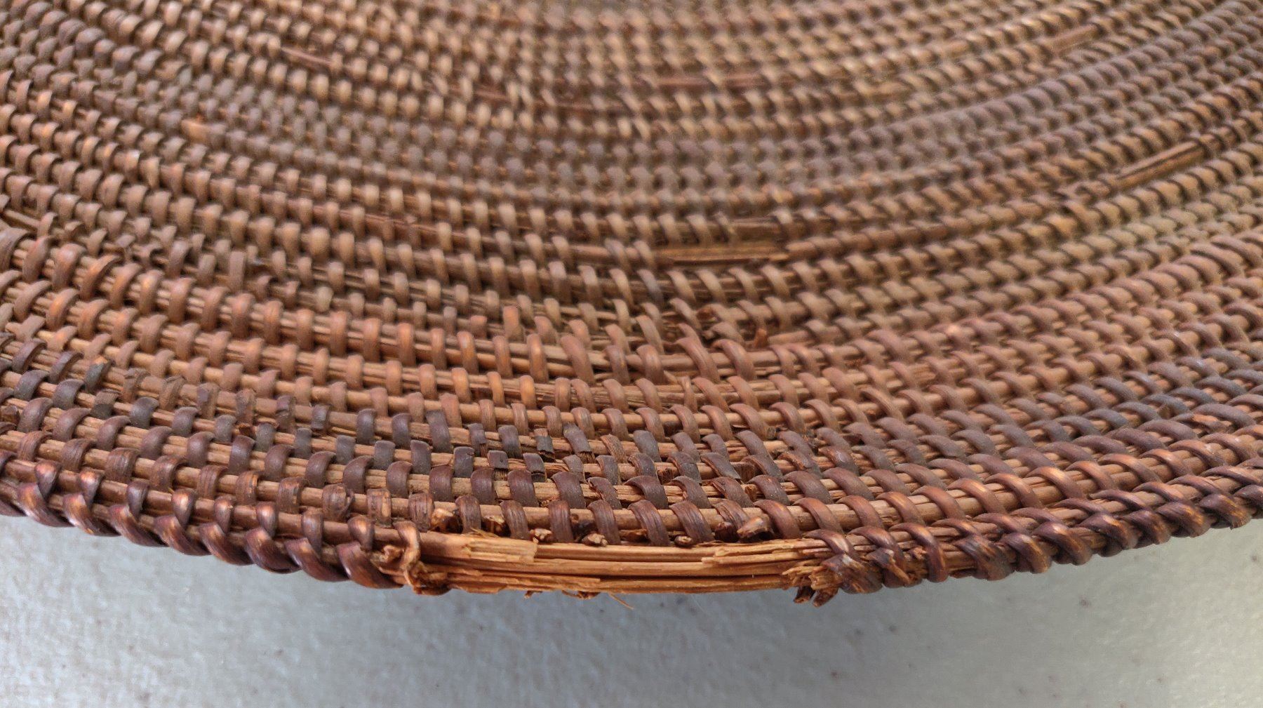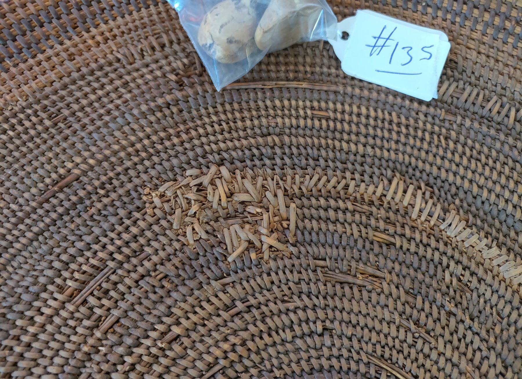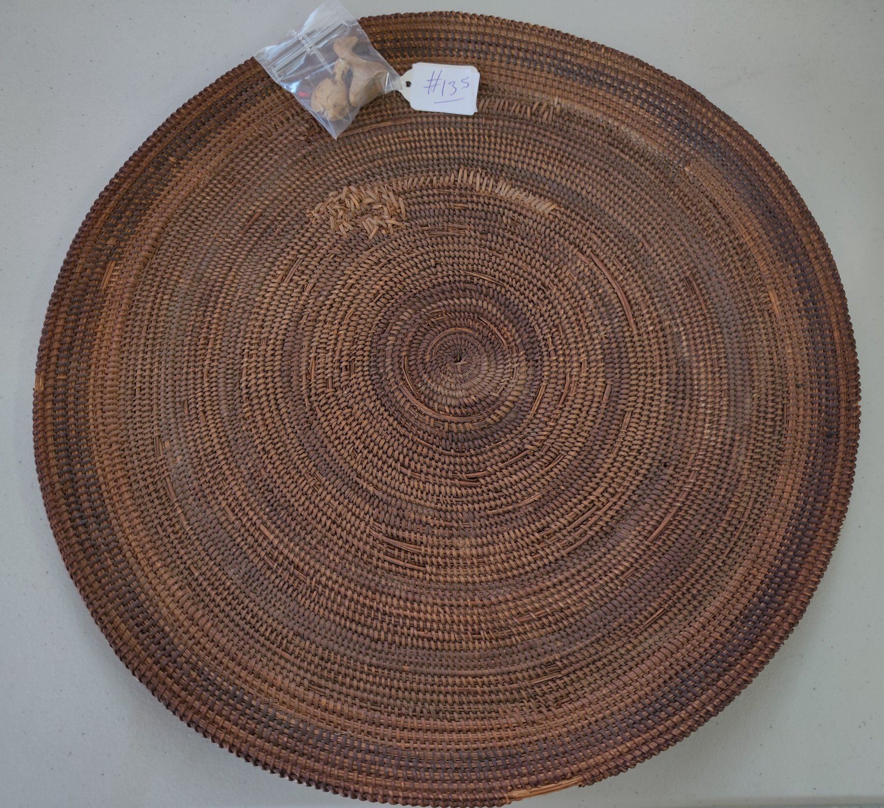 Gambling Tray & Pieces, c. 1850s. Made of willow and grass, the item measures 15" tall, and the 2 figures measure 1 1/2" each. Yokut, central California. Condition: Old repair, see images. Shipping: $35.00 w/insurance and signature, due to size.
