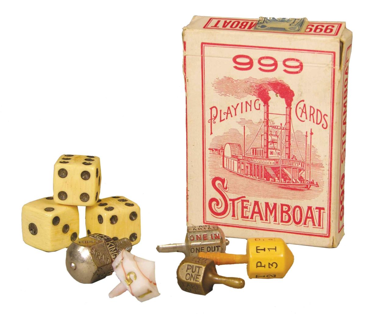 Asst. of Gambling items including Deck of Steamboat Playing cards, five put-in-take spinners and three bone dice.