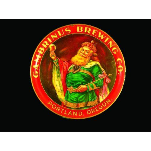 Gambrinus Beer Tin Serving Tray. Some scuffs and scrapes otherwise good condition. 13 inch diameter.
