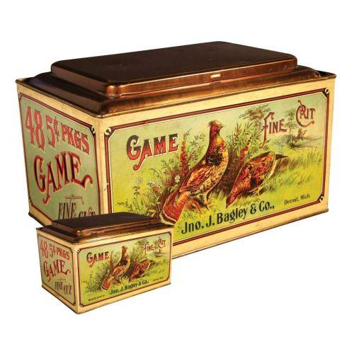 Game Fine Cut Tobacco Store Tin. Jno. J. Bagley Co., Detroit, MI. Excellent condition. 11 1/2 X 7 1/2 X 8 inches.