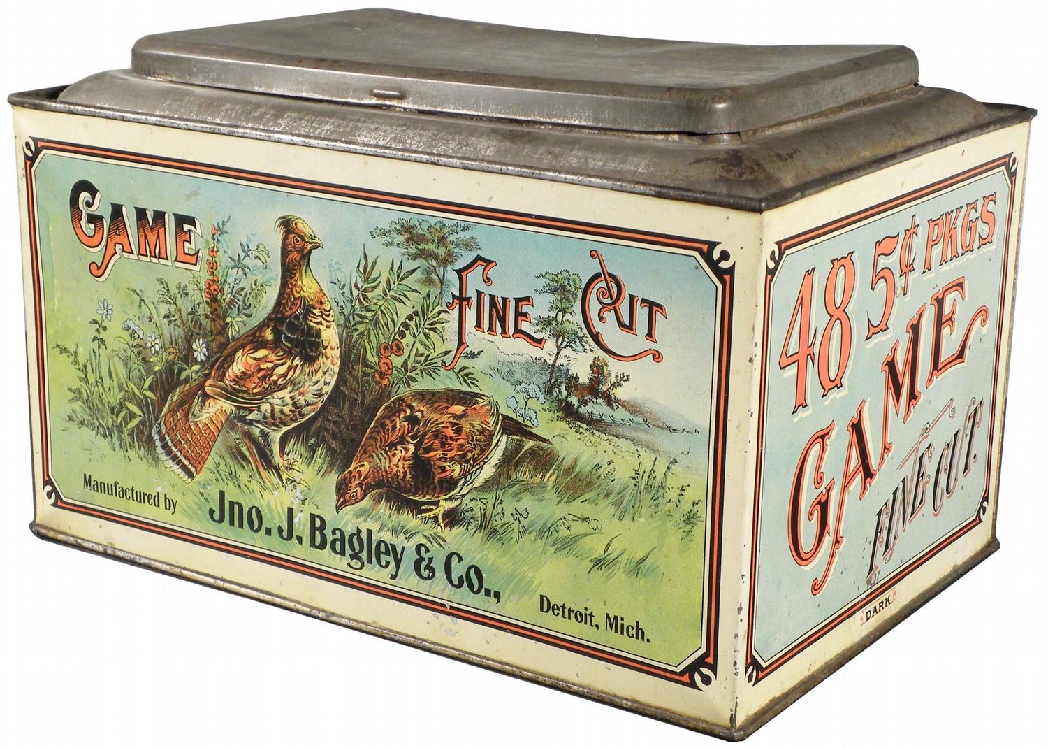 Game Fine Cut Tobacco Tin Store Bin. Mfg. Jno. J. Bagley & Co. Detroit, MI. Excellent original condition. 11 1/2 X 7 1/4 X 8 inches.