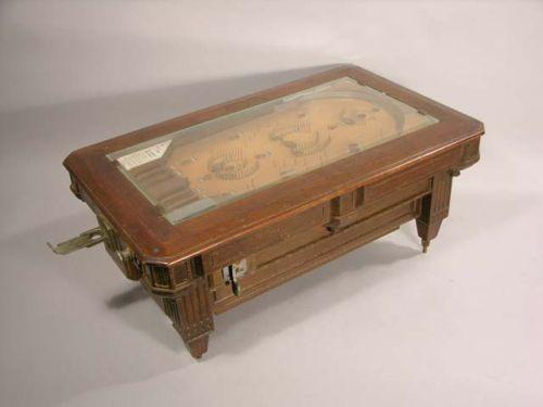Walnut early game of skill 1 cent trade simulator with beveled glass in shape of an early billiard table. 25" x 15" x 11" Ex. cond.