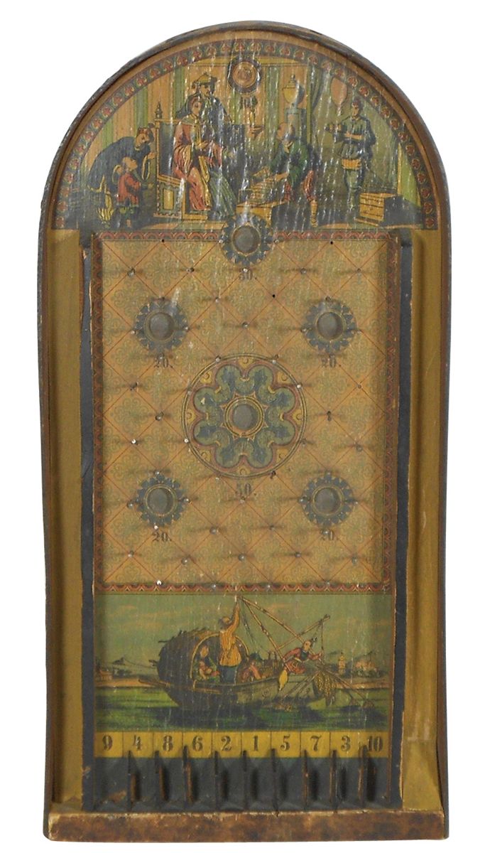 Game board, marble pin game w/Chinese paper lithos over wood, c.1900, VG cond missing a few pins, 18"H x 9"W.