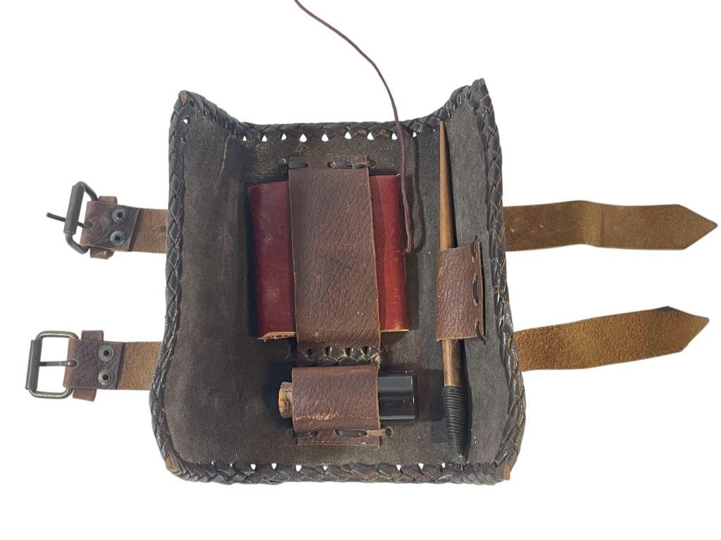 Original Lanister messenger satchel with ink, pen and note pad used in the production on the fantasy drama television series 'Game of Thrones' (2011-2019), where nine noble families fight for control over the mythical lands of Westeros, while an ancient enemy returns after being dormant for thousands of years.