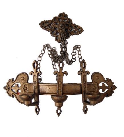 This bronze-colored candleholder hangs from the wall, just as it did in the filming of the medieval epic Game of Thrones (2011 - ) that just won the Emmy for Best TV Drama.  Designed to appear like it came straight from a knight's chamber, it has a middle ages look and holds three candles.  Approx. 19" x 9".