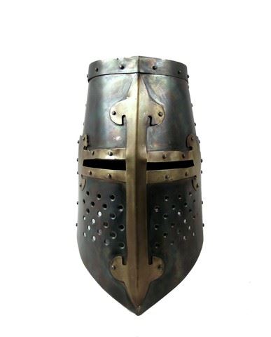 This copper medieval helmet with eye slits and breathing holes comes from the set of the medieval epic TV show Game of Thrones (2011 - ), which is chock-full of knights and their accoutrement. Made of metal. Approx. 14 1/2" high x 12" deep.