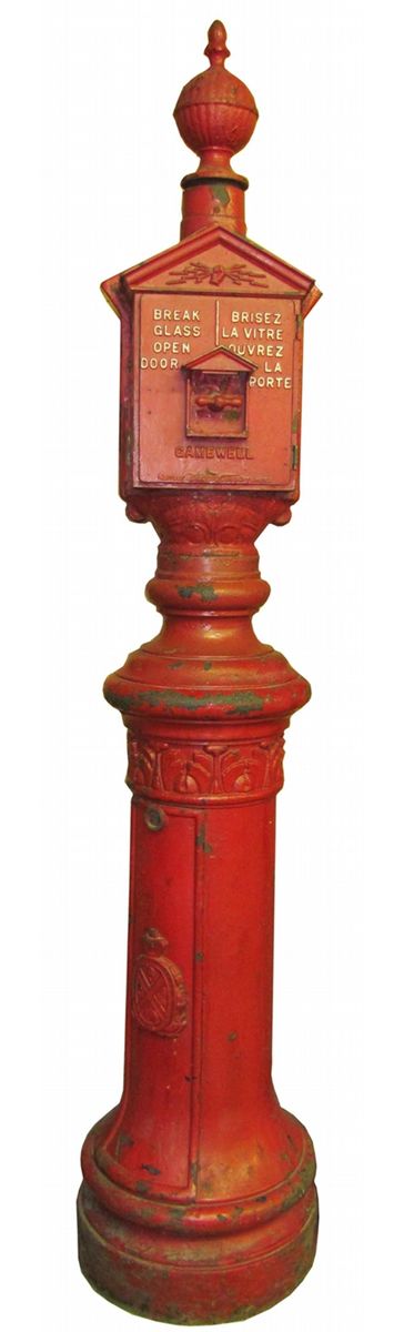 Gamewell Fire Alarm Box on original base. Two sided. Made in the US for Canada. Royal Crown on base. No contents or inside key. Some paint loss otherwise overall good condition. 90 inches tall.