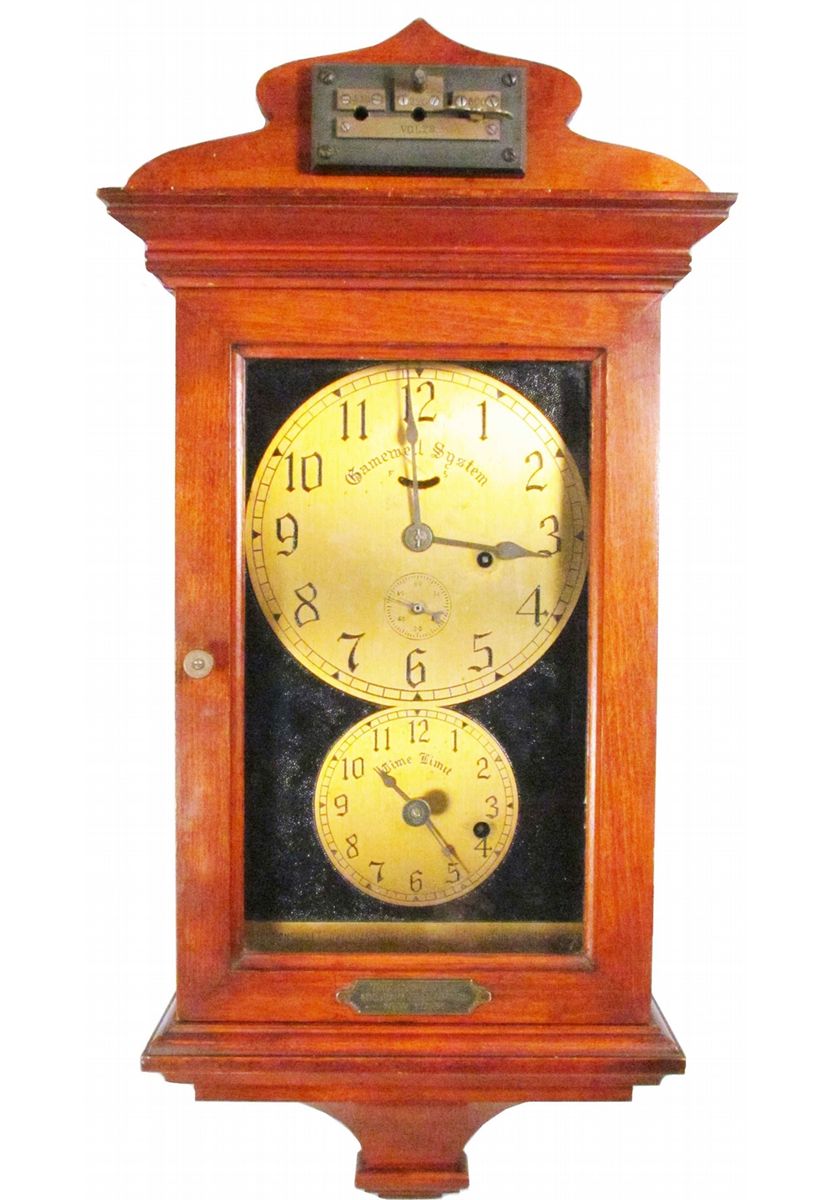 Gamewell Fire Alarm Clock, Ca. 1870. This clock was utilized in the alarm stations for recording fire alarms. Cherry wood cabinet. Electrical device on top of unit reads 110/220/500 volts. Makers tag on front door. Excellent condition. 11 1/2 X 24 X 5 1/4 inches.