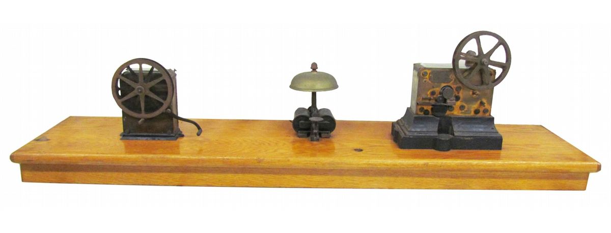 Gamewell Fire Alarm Register. Take up reel and muffin bell. 1/2 " size tape. Early hole punch style. Makers plaque on side, Pat. 1902. Brass and beveled glass on original mounting board. 2 small chips at corner of glass panels, missing hole punch collectors. 49 inches wide.