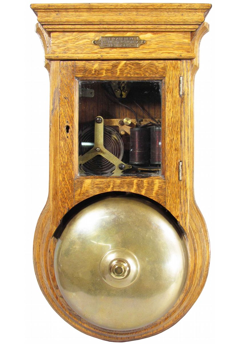 Gamewell Gong Bell. Gamewell Fire Alarm Telegraph Co. New York. Beautiful Oak Cabinet. Has a brass tag inside with a # 30 on it. Has the lock on the door but no Key Hole Cover. Excellent Condition. Brass bell is 8 inches in diameter and the gong is 21 inches tall.