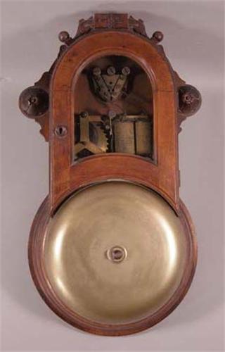 Gamewell springwound fire gong bell, 21" x 11" bell 8.5" diameter, inside mechanism says made by Moses G. Crane, Boston Mass. Made for GFATC, NY. Beautiful walnut cabinet, pat. 1881, Ex. cond.