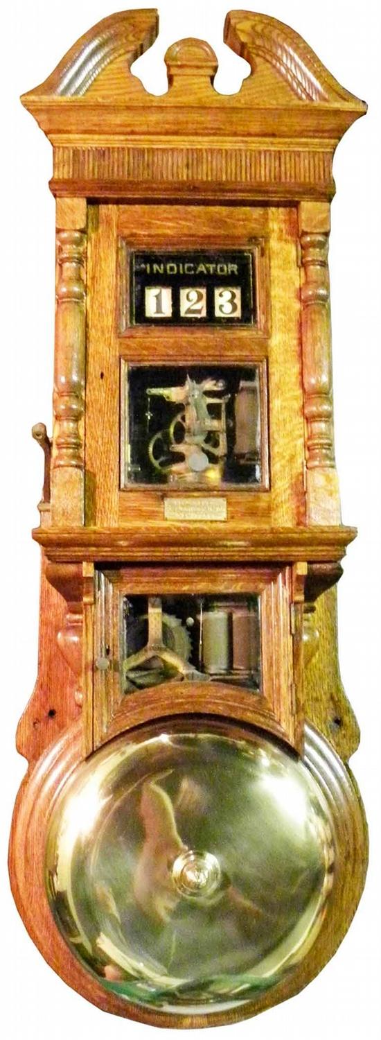 Gamewell Fire Indicator. The Gamewell Fire Alarm Telegraph Co. NY. Oak cabinet. Excellent restored condition. 52 1/2 inches tall w/ 15 inch diameter bell.