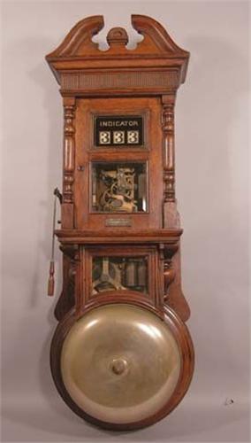 Gamewell Indicator firehouse gong, 53" x 18", bell 15", Gamewell Fire Alarm Telegraph Co., NY. Beautiful oak case/brass bell/pat. June 1881. Ex. cond.